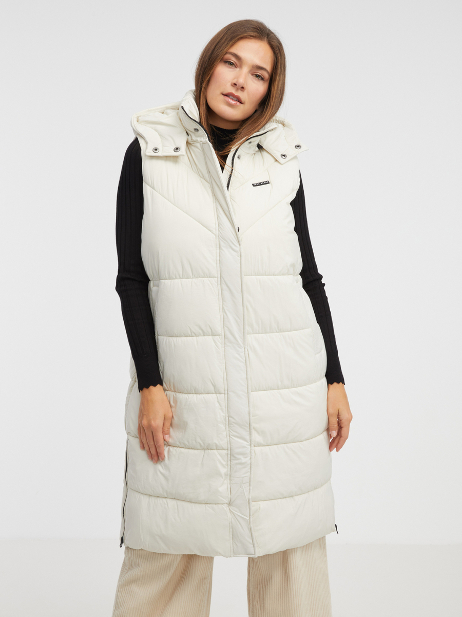 Dámská krémová dlouhá vesta od Pepe Jeans.Odepínací kapuce. Zapínání na zip.Dole po stranách zip na rozepnutí.Materiál:vrchní vrstva 58% polyester42% nylonVýplň:100% polyesterpodšívka 100% polyesterStřih:Regular Fit