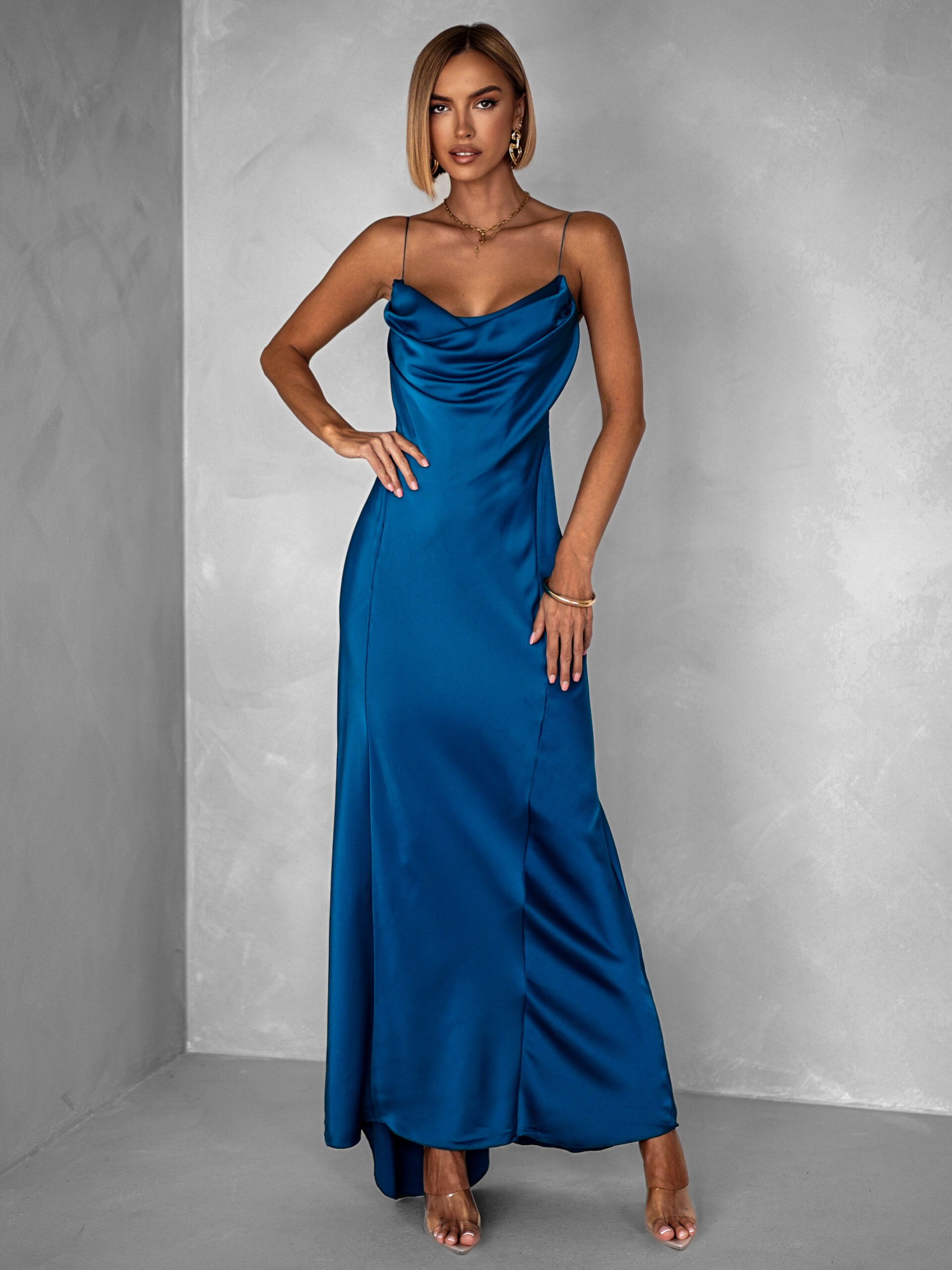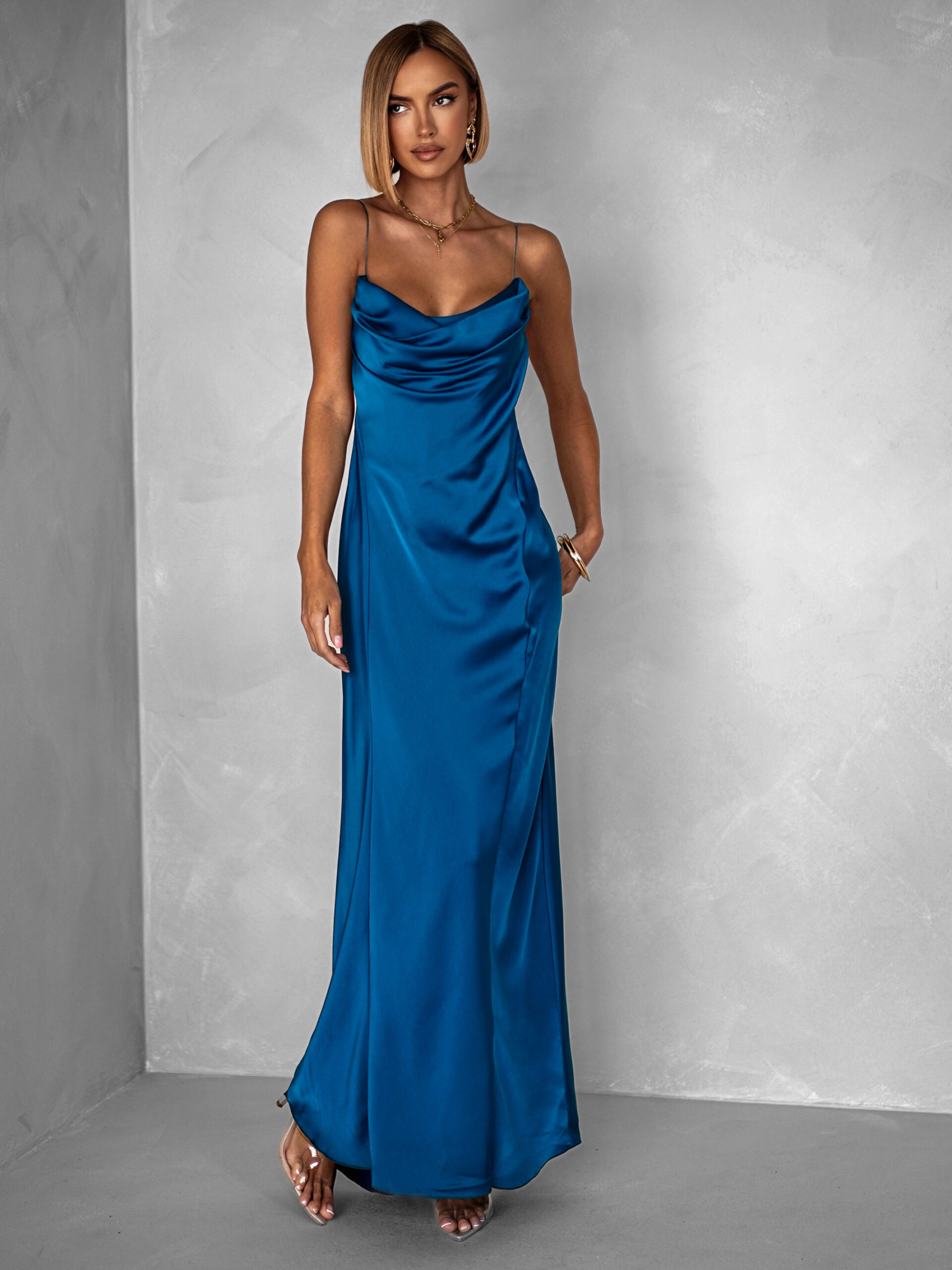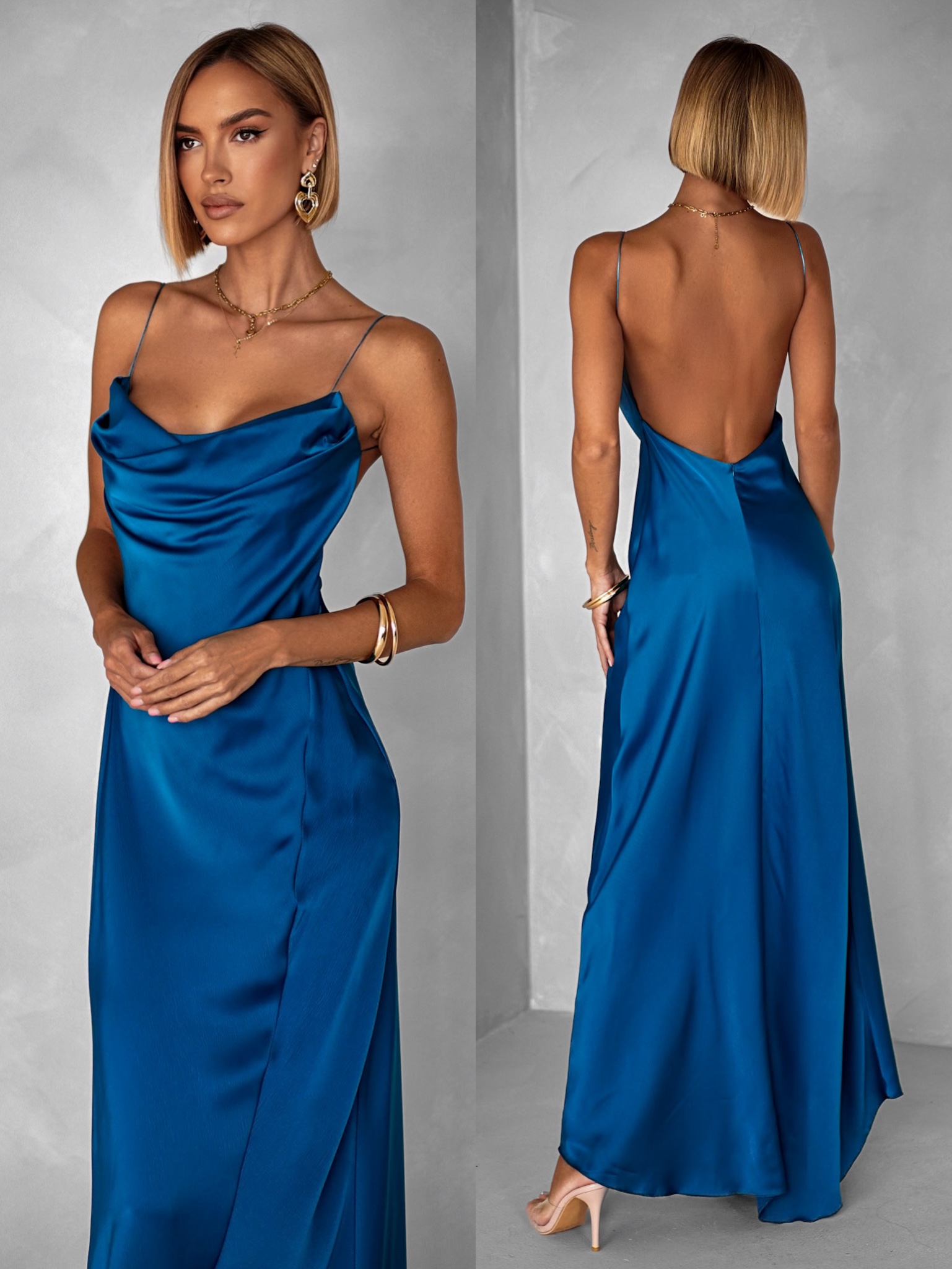 Petrolejové dlouhé saténové šaty UNUTA s odhalenými zády Velikost: ONESIZE
