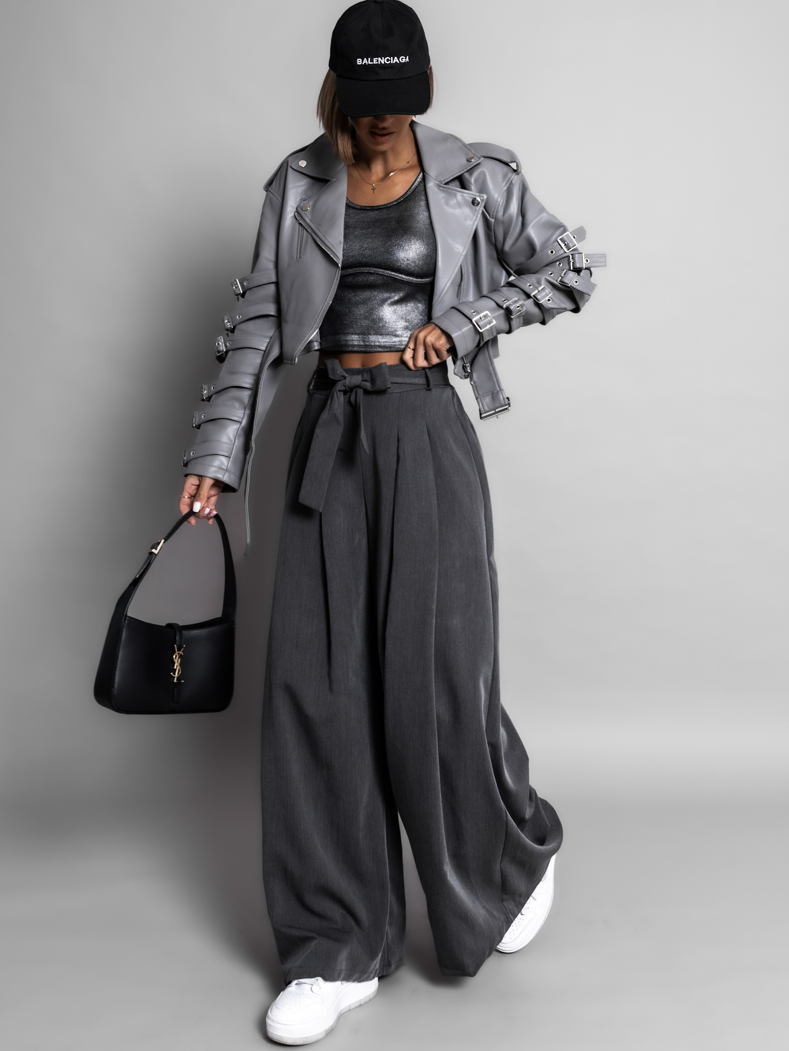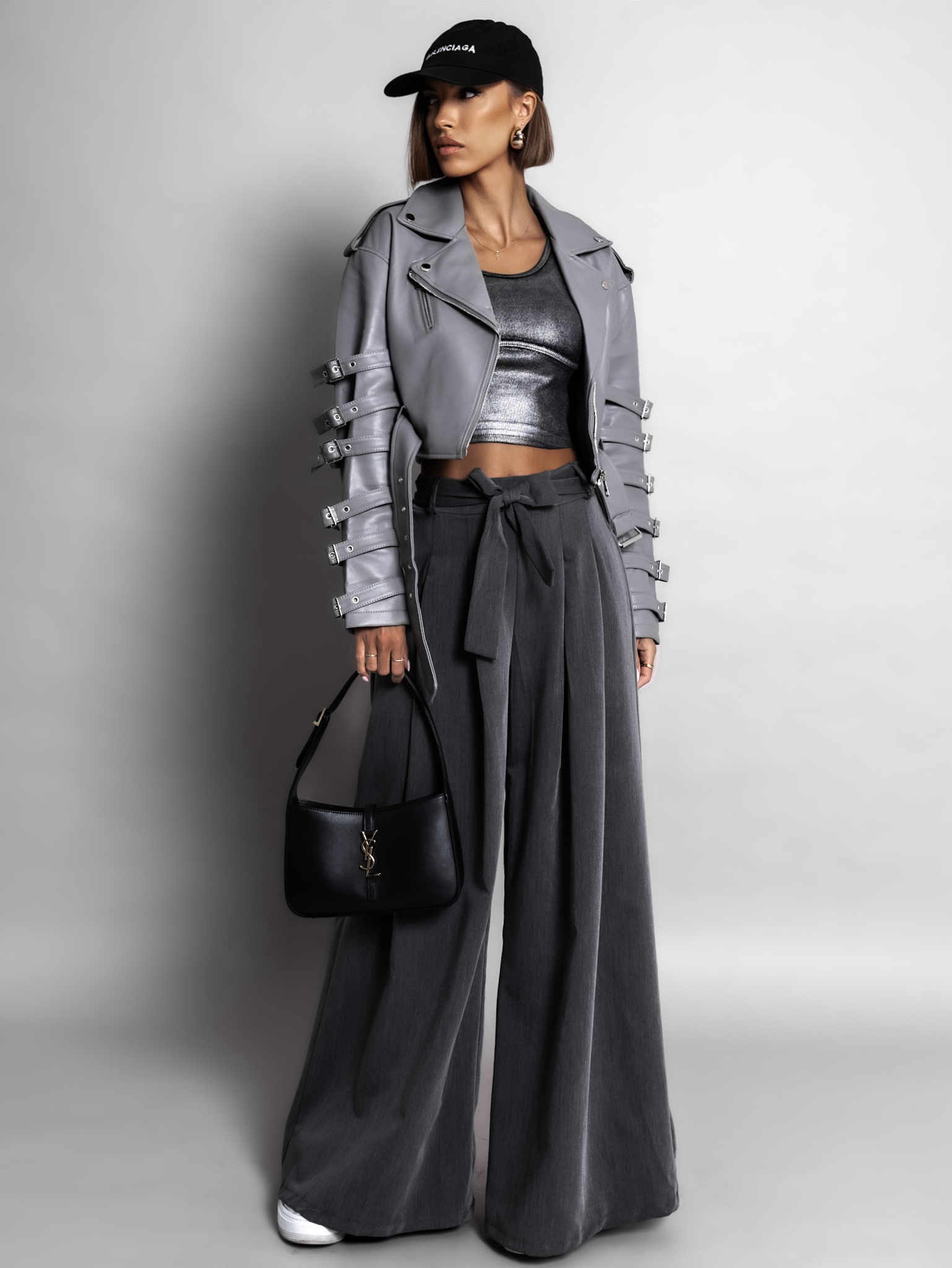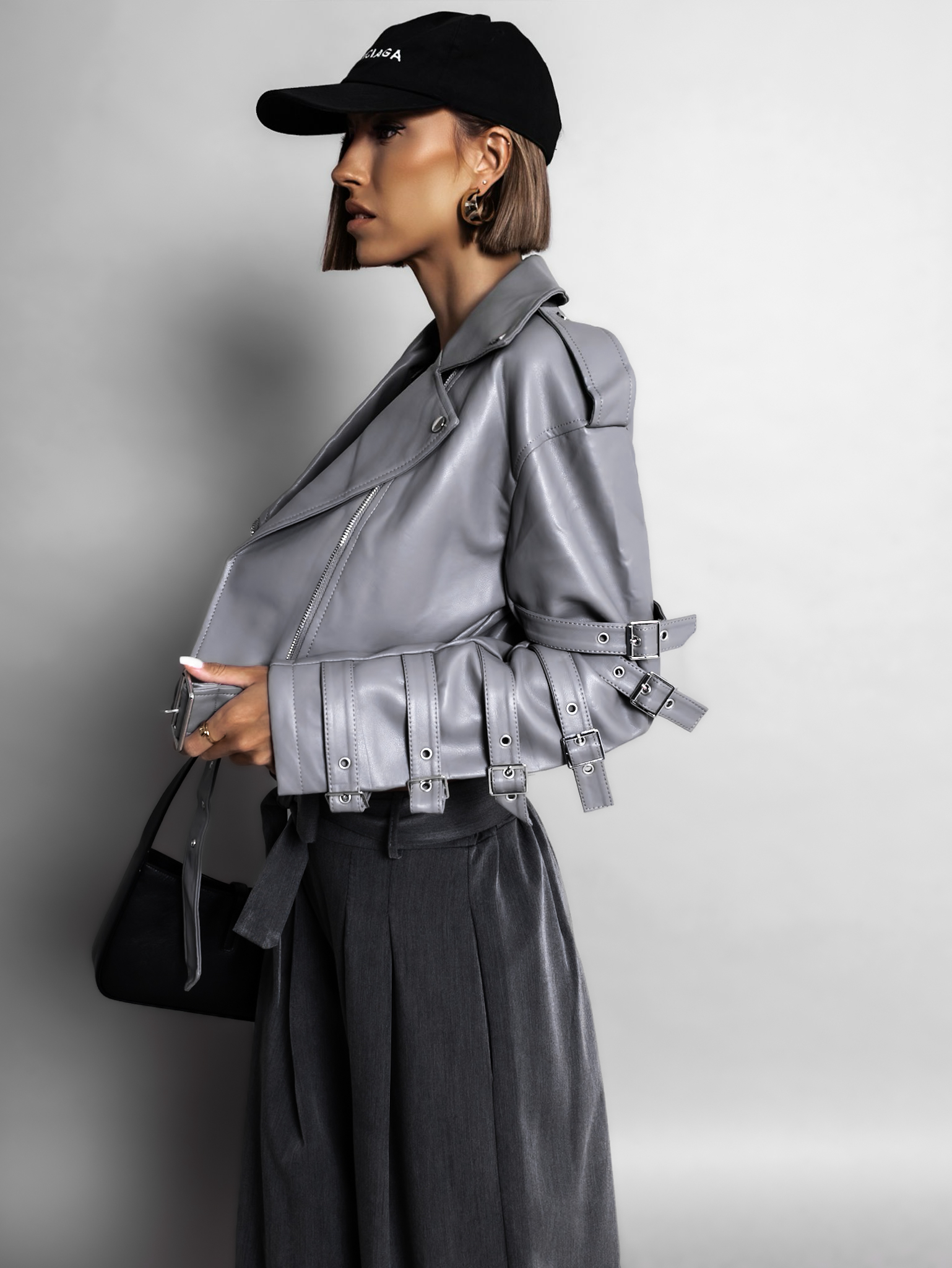 Šedá biker koženková bunda SUELITA s pásky Velikost: L