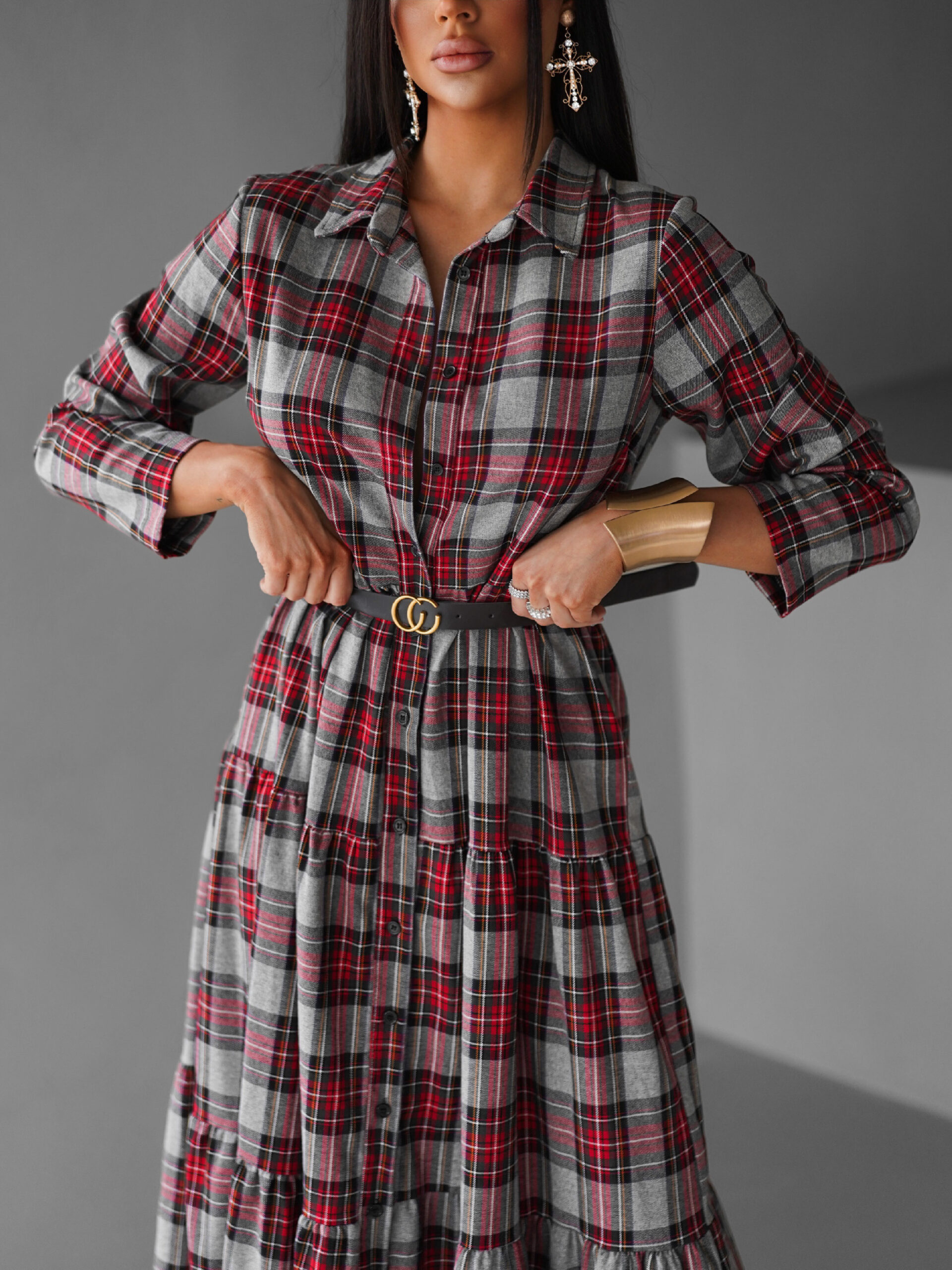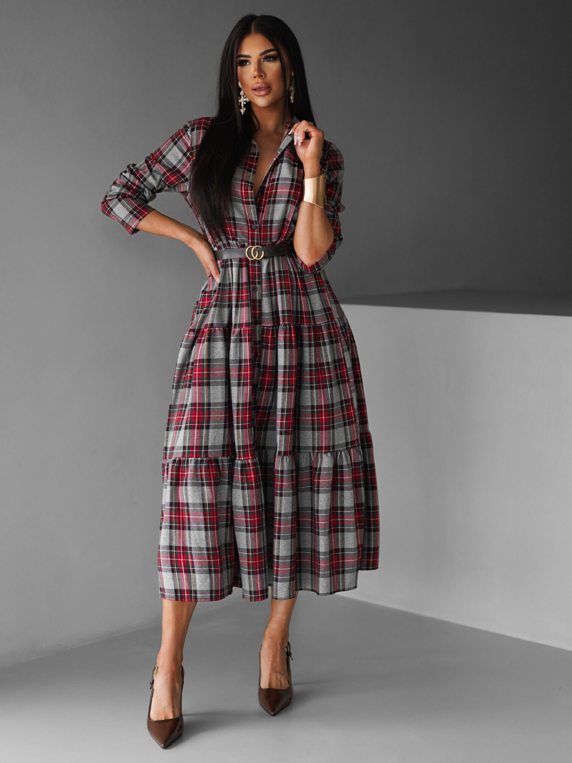 Šedočervené bavlněné košilové šaty BARRYS s páskem Velikost: ONESIZE