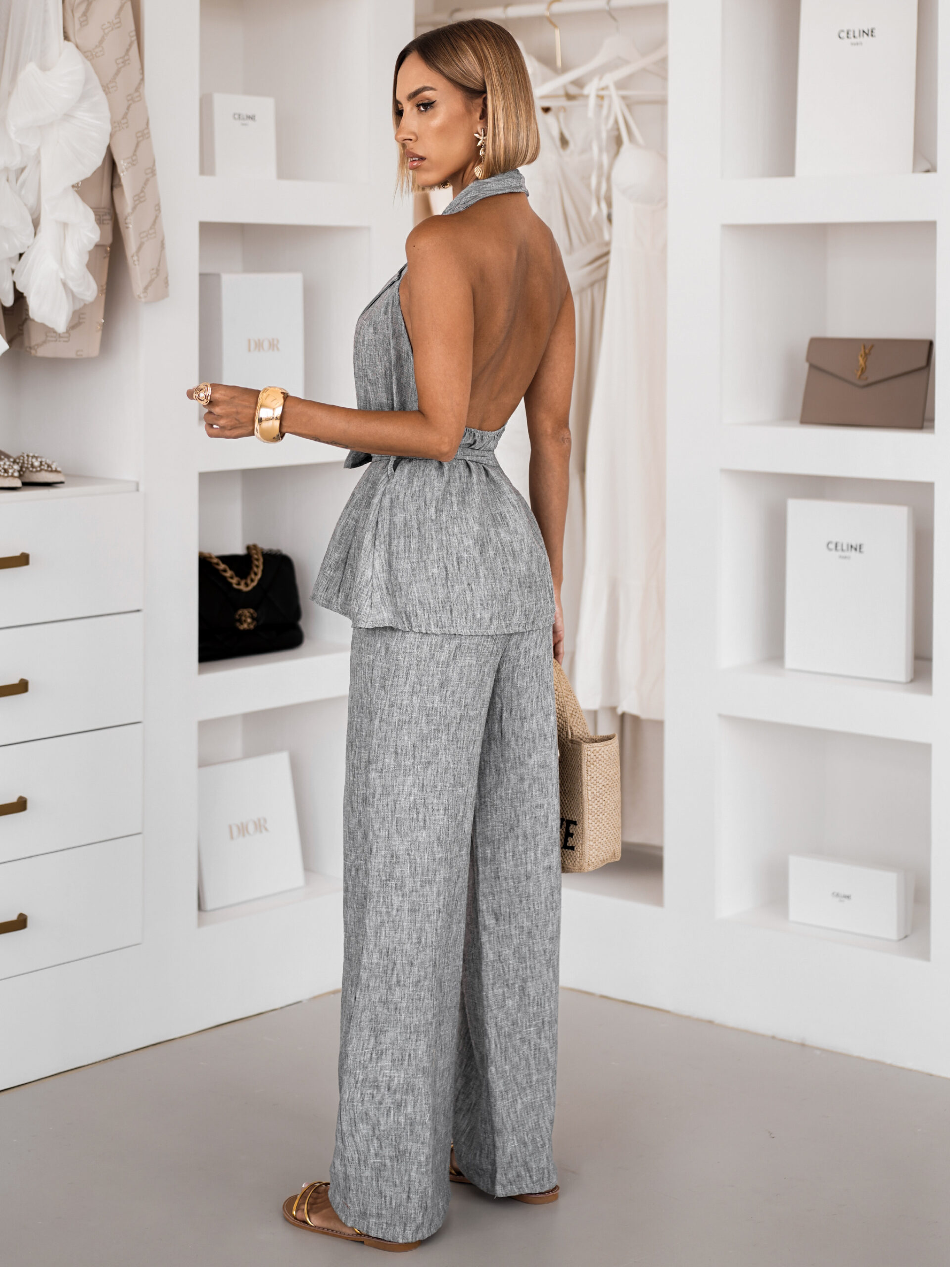 Šedý elegantní kalhotový dlouhý komplet OLENIRI Velikost: ONESIZE