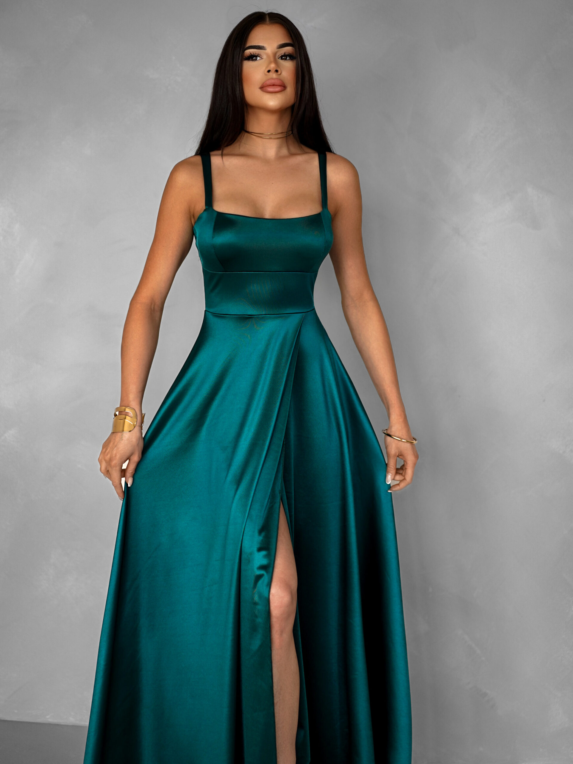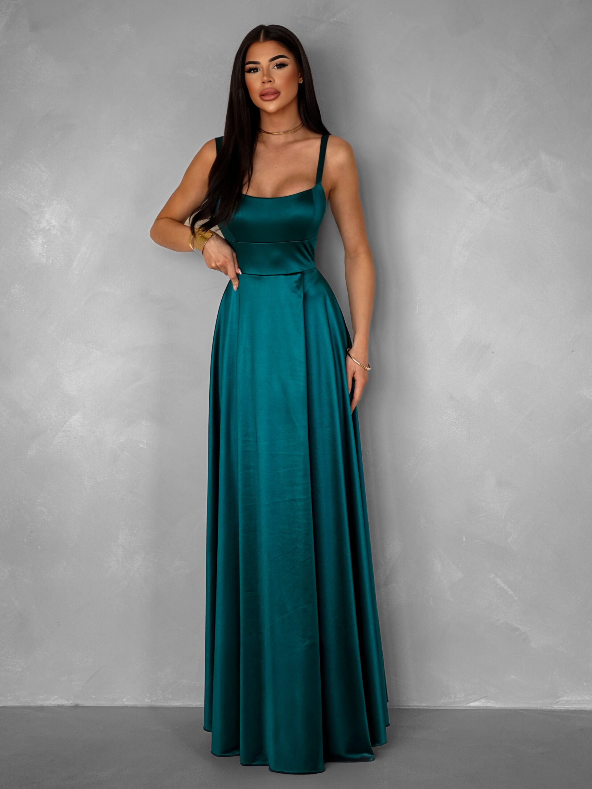 Smaragdové dlouhé saténové šaty HELSIN na ramínka Velikost: ONESIZE