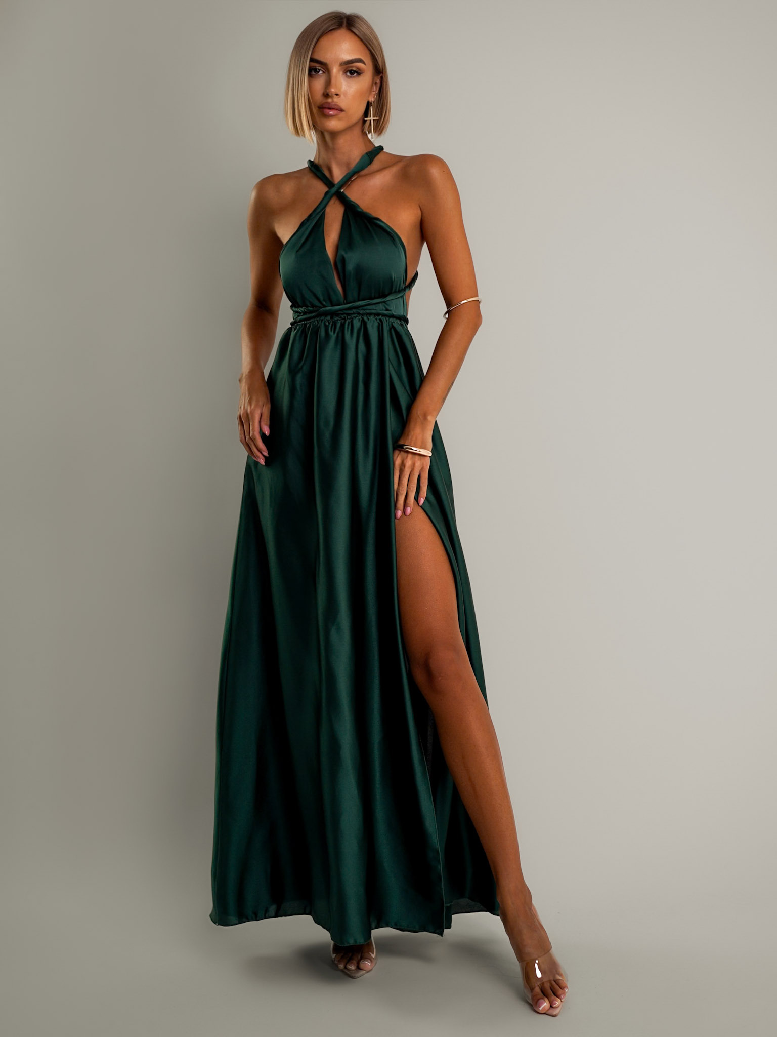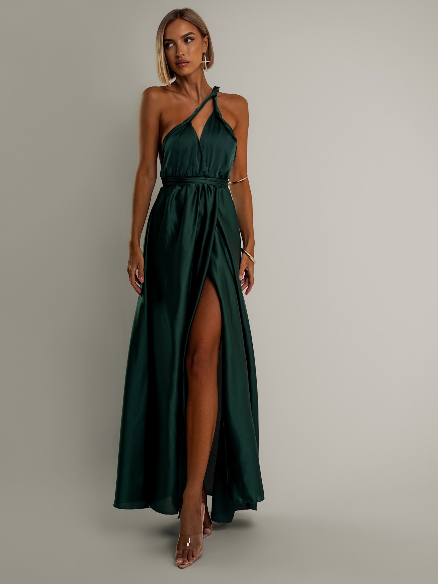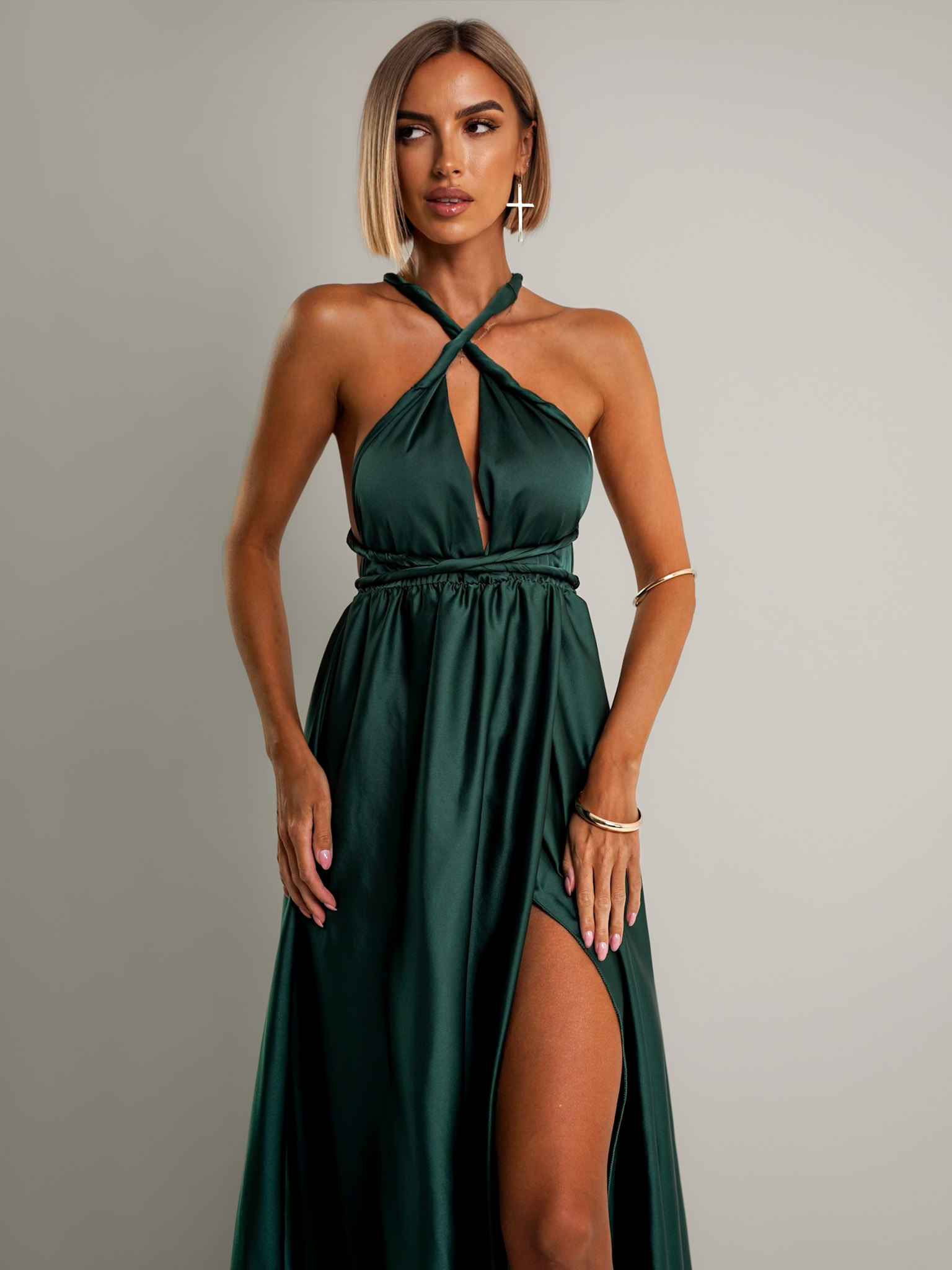 Smaragdové lesklé šaty VALERDI s variabilním vázáním a rozparkem