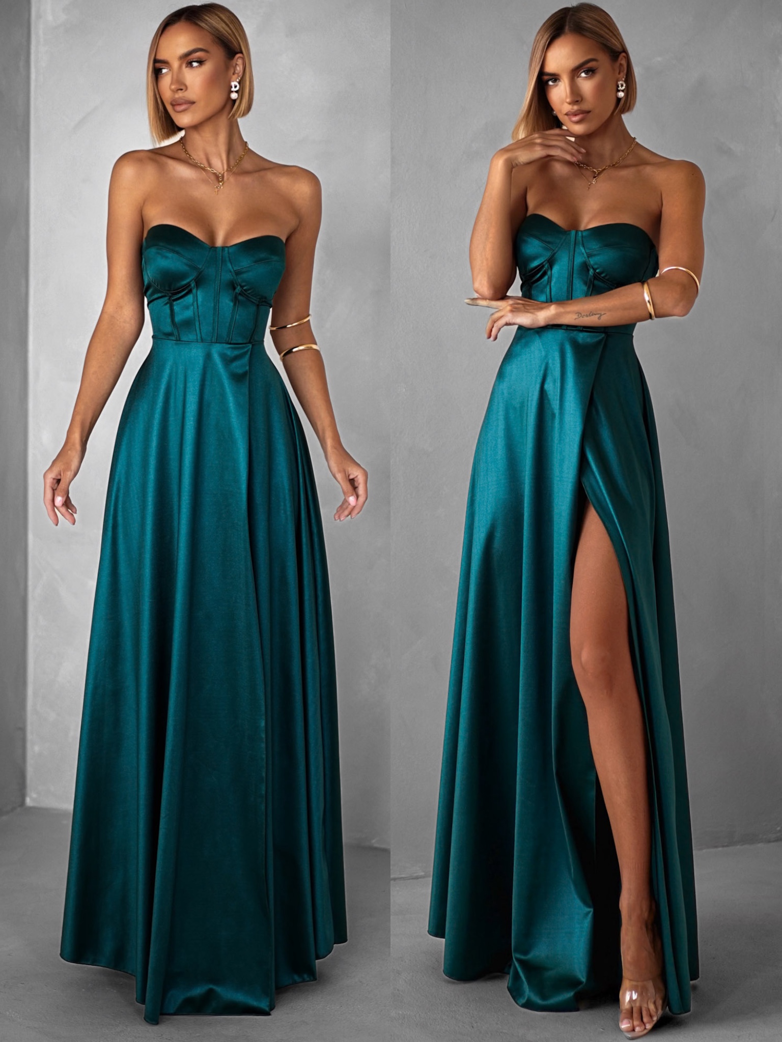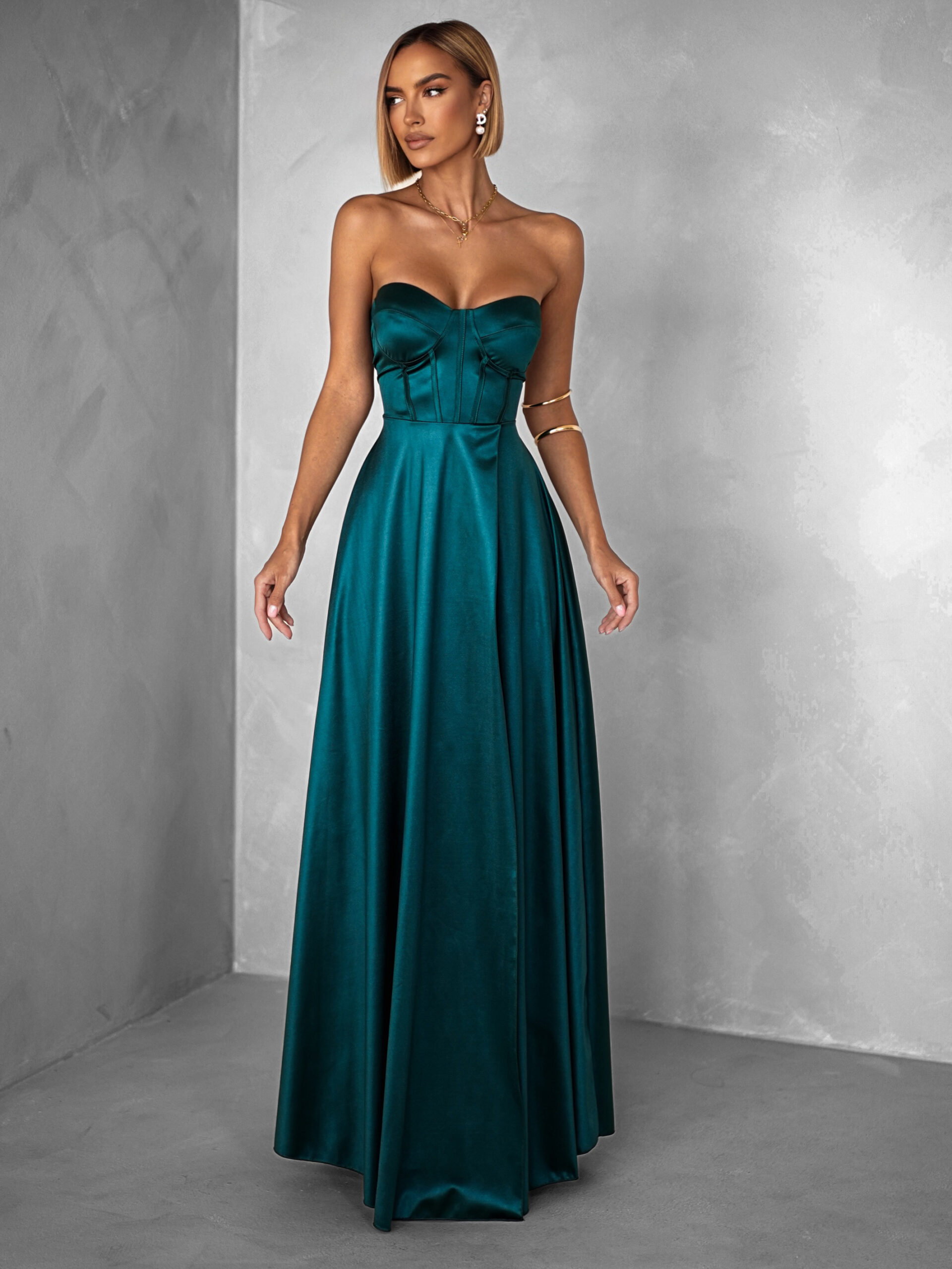 Smaragdové saténové společenské dlouhé šaty GYBRAL s korzetem Velikost: ONESIZE