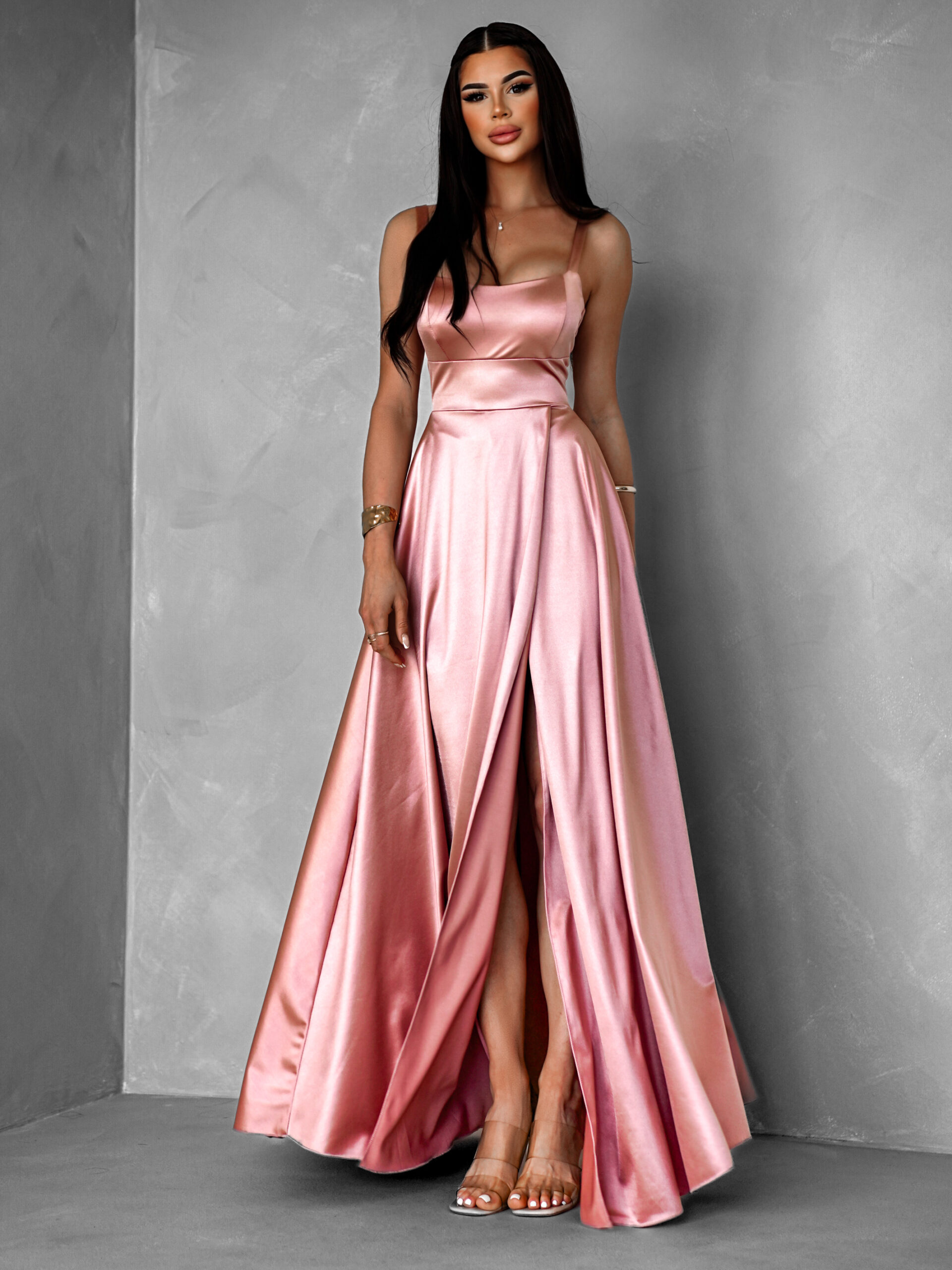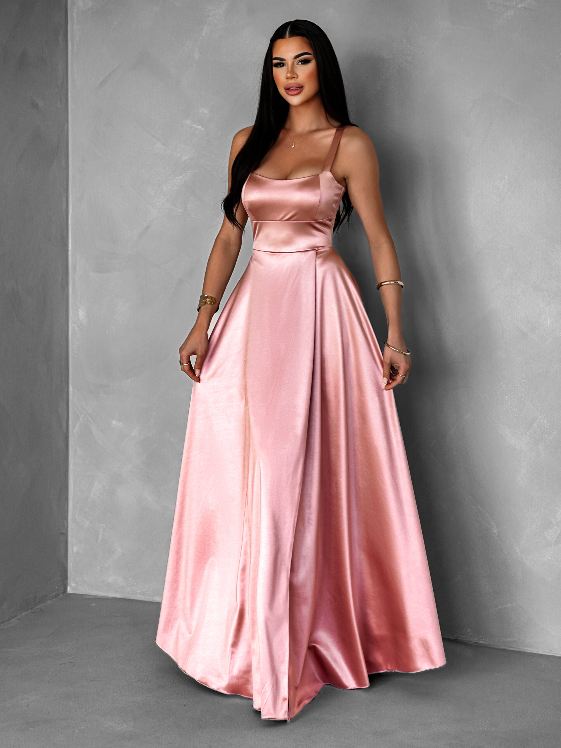 Starorůžové dlouhé saténové šaty HELSIN s výstřihem Velikost: ONESIZE