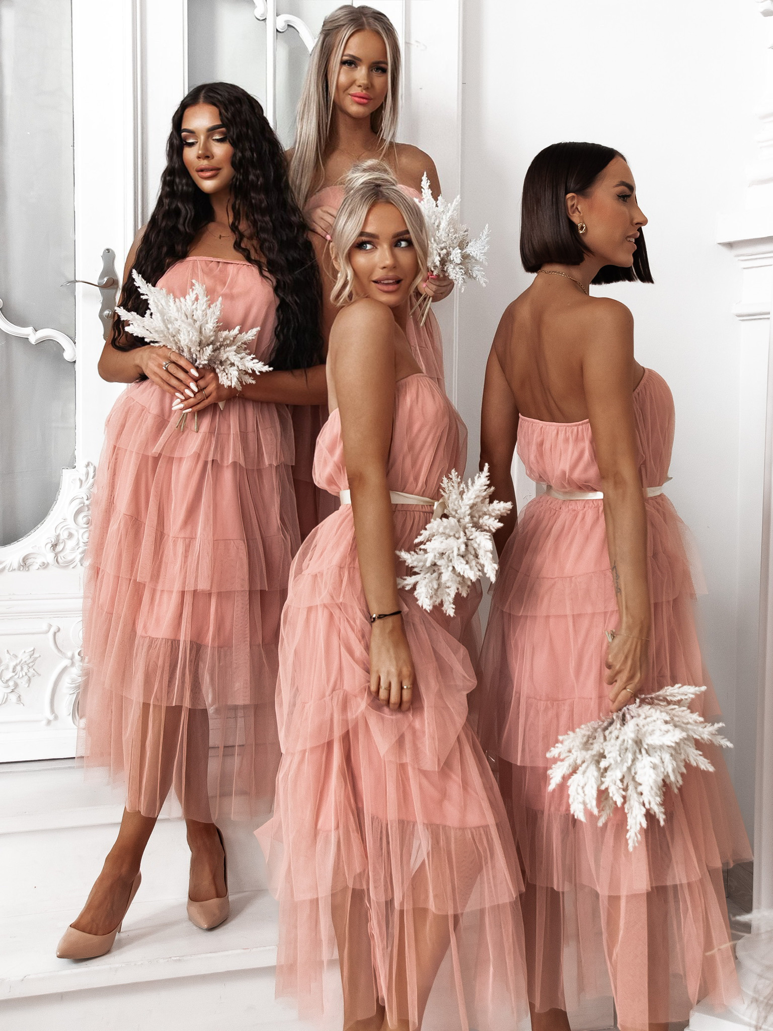 Parádní šaty vyrobené z tylového materiálu jsou skvělou volbou pro tým družiček! Volánky a mašle v pase dodají svatbě nadčasový a elegantní styl.