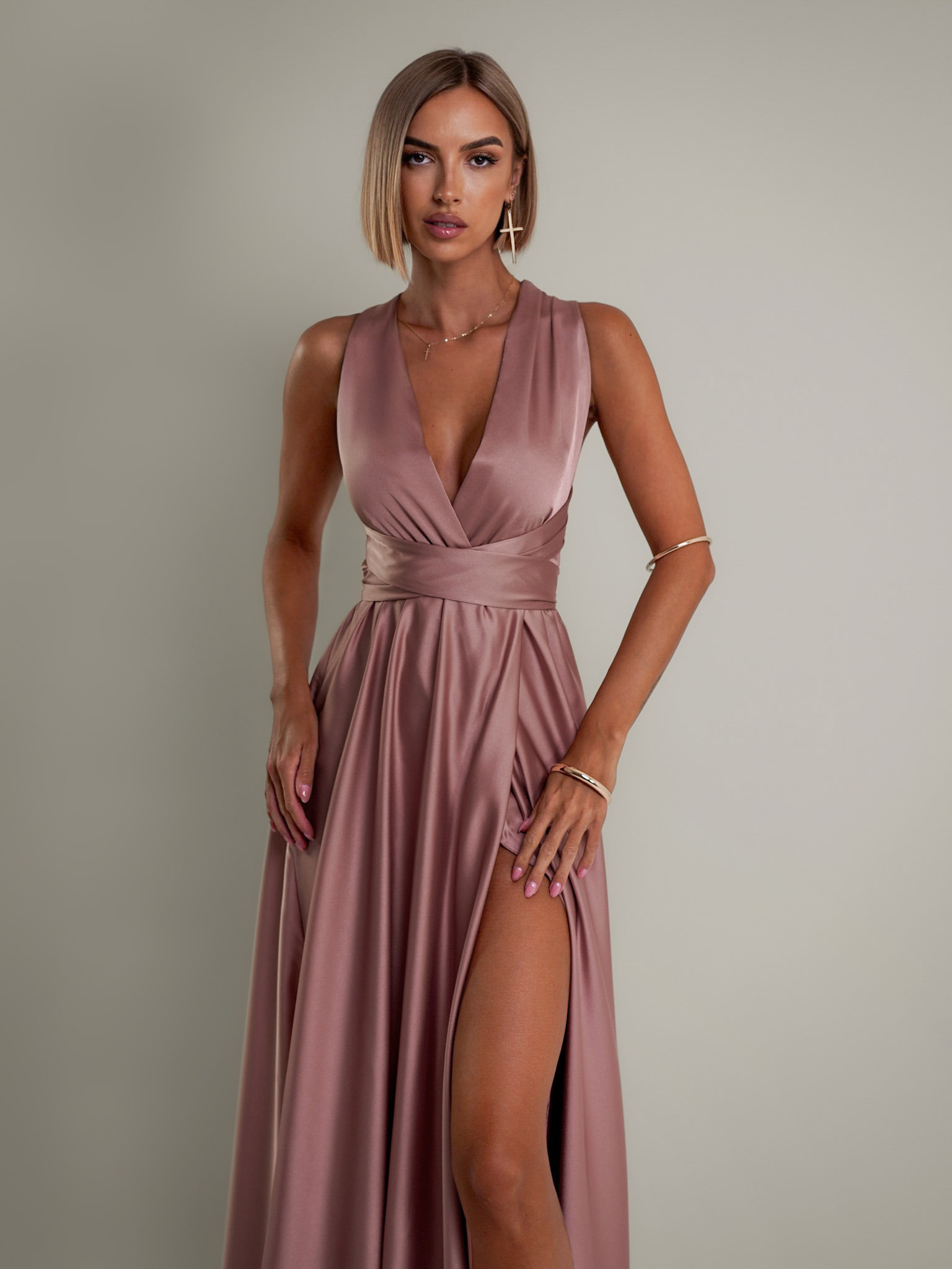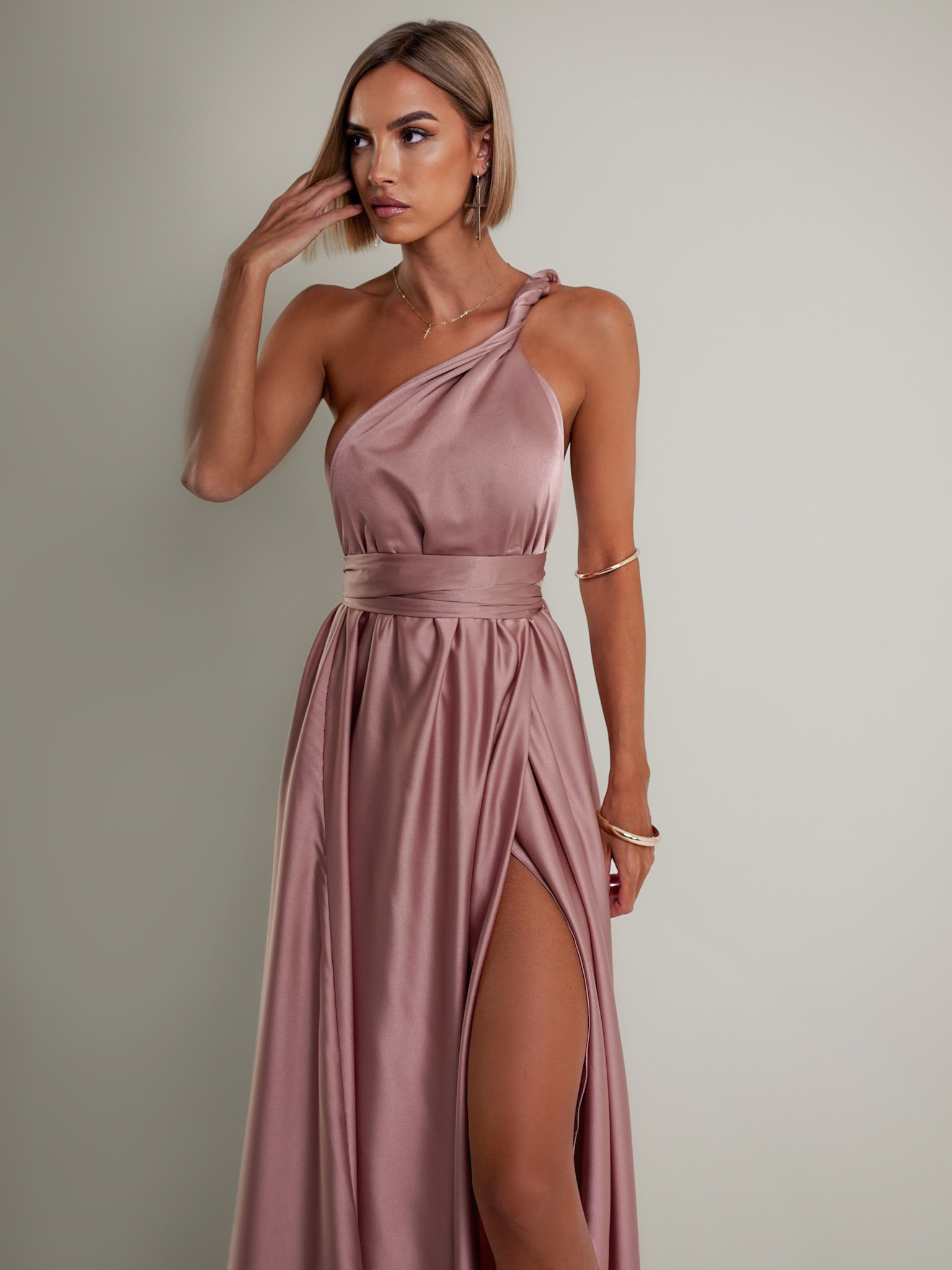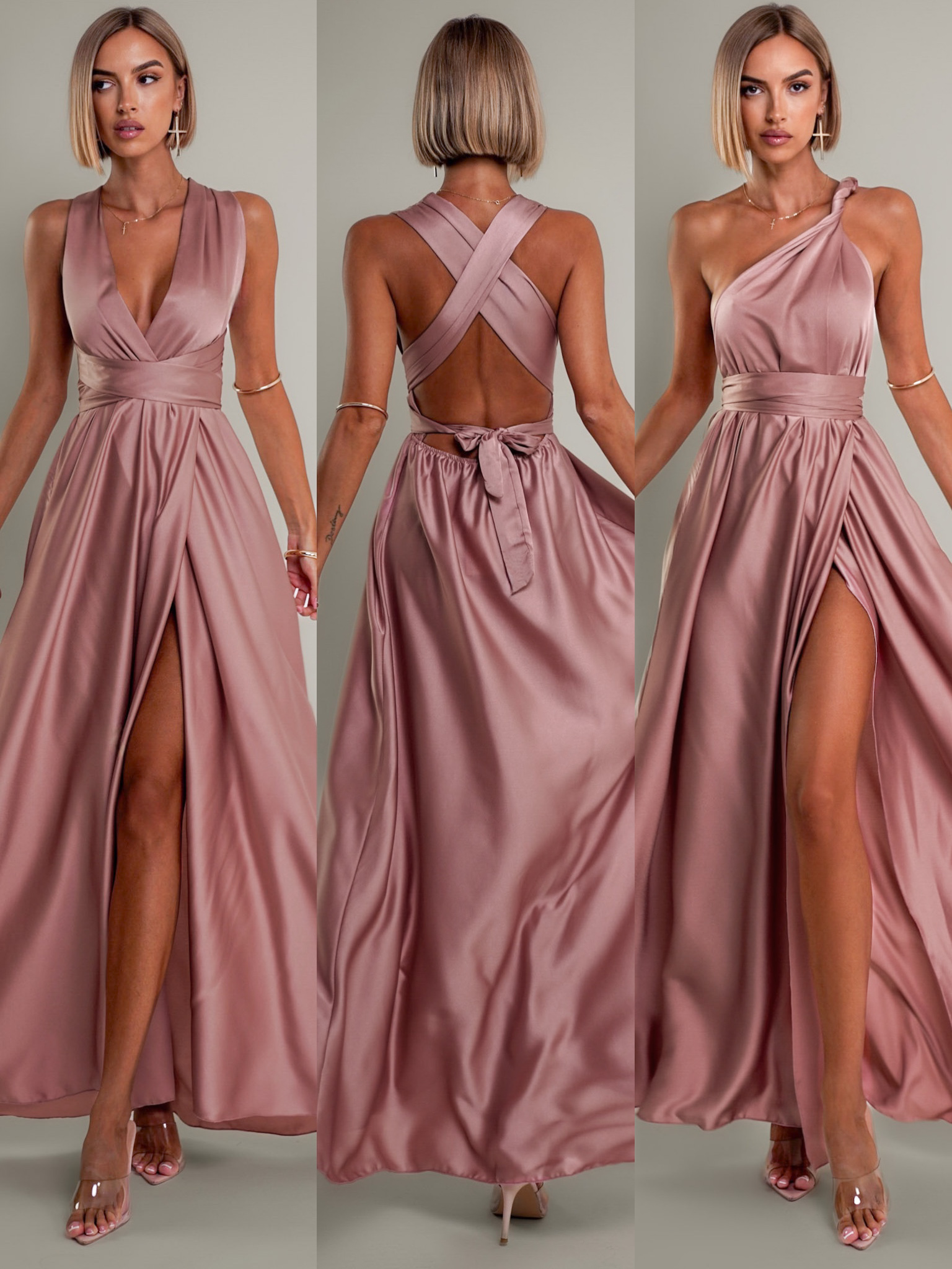 Starorůžové lesklé šaty VALERDI s variabilním vázáním a rozparkem