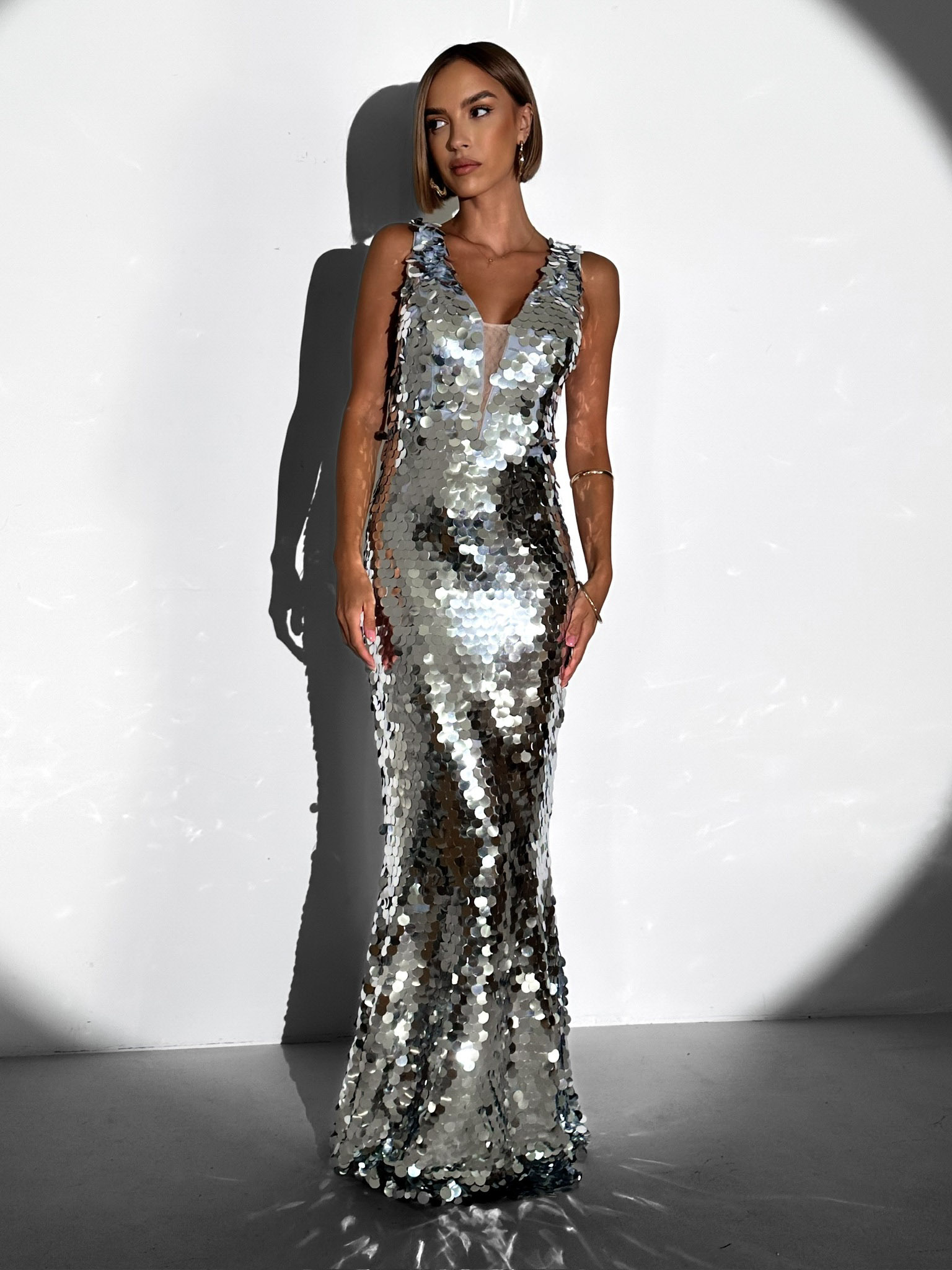 Stříbrné třpytivé dlouhé večerní šaty SYVAT Velikost: L