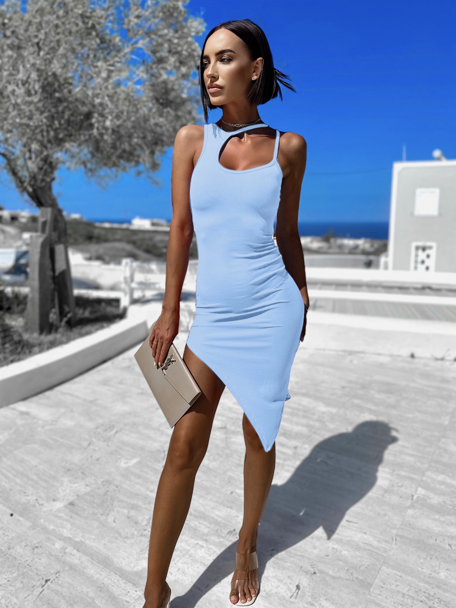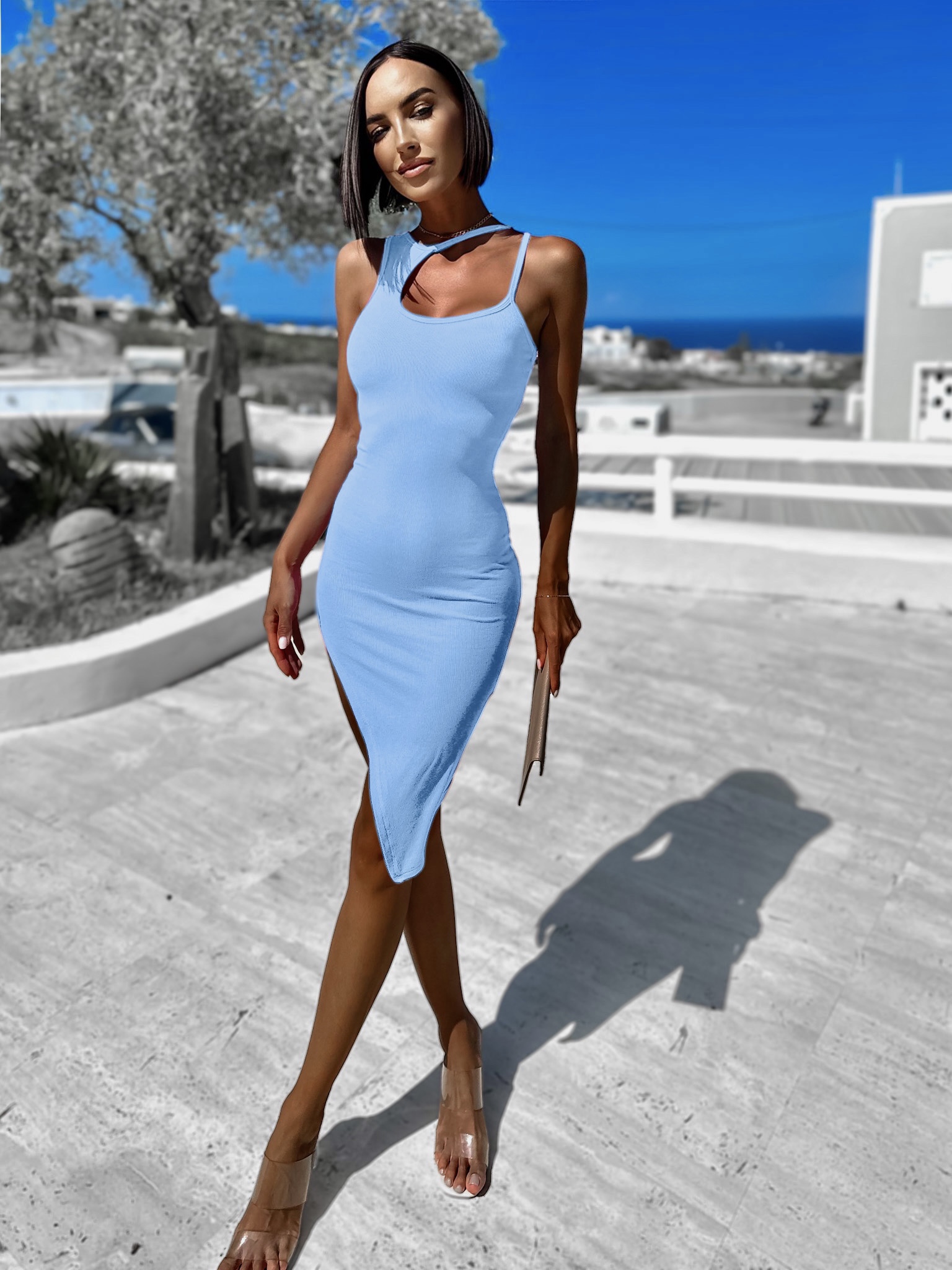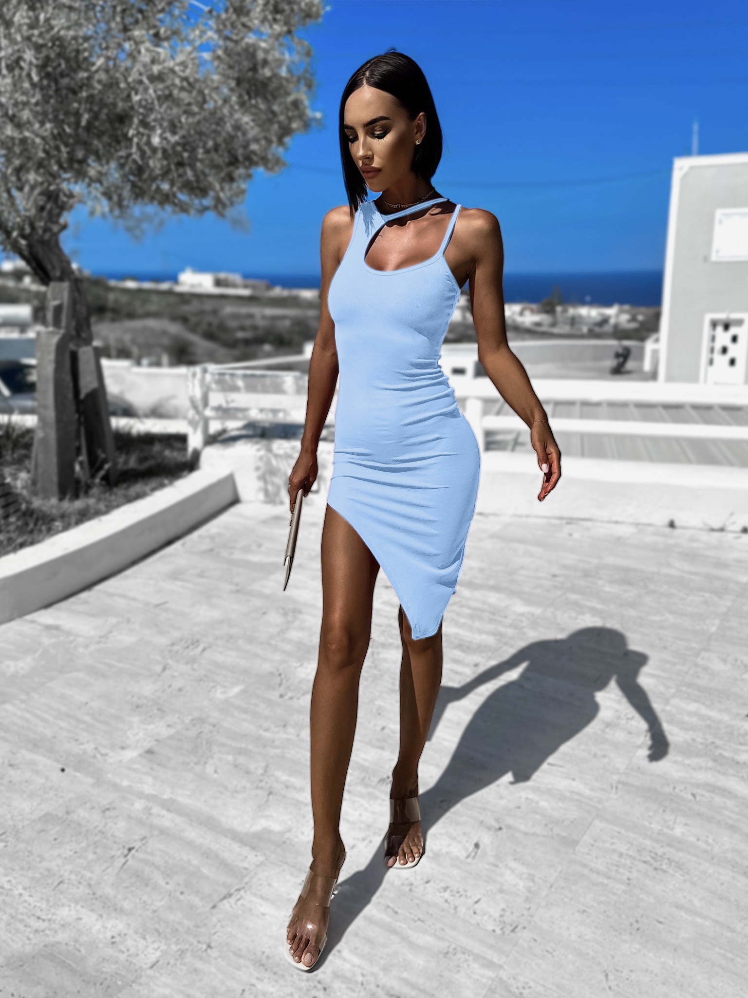 Světle modré žebrované šaty TARPE s rozparkem Velikost: M/L