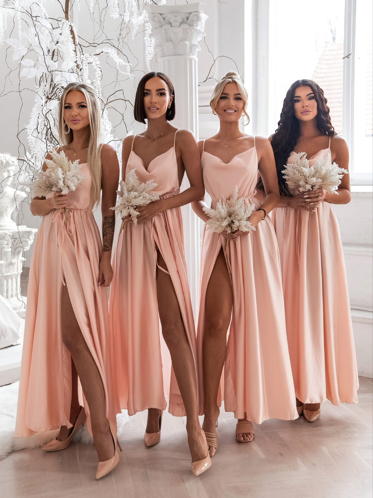Tyto dlouhé šaty s názvem Yasmine jsou vyrobeny ze saténového materiálu, mají volný výstřih s nastavitelnými ramínky a zavazování v pase. Jsou také vybaveny rozparky pro větší pohodlí a volnost pohybu. Jsou vhodné na různé příležitosti, včetně outfitů pro družičky, plesů nebo dovolenou u moře.