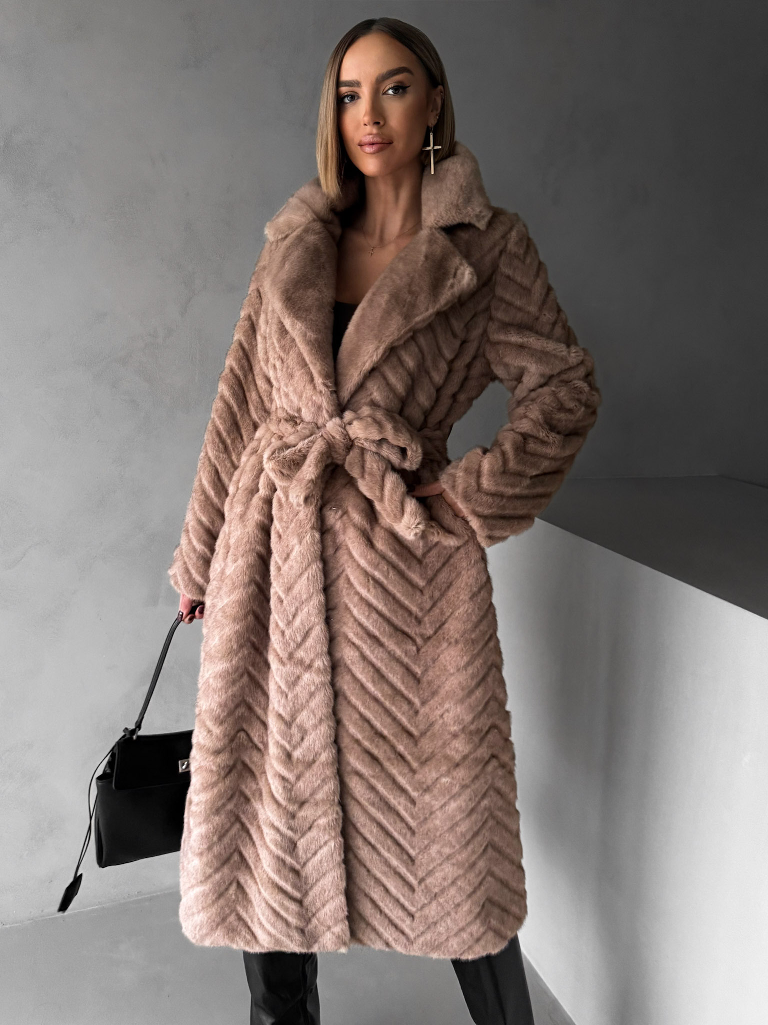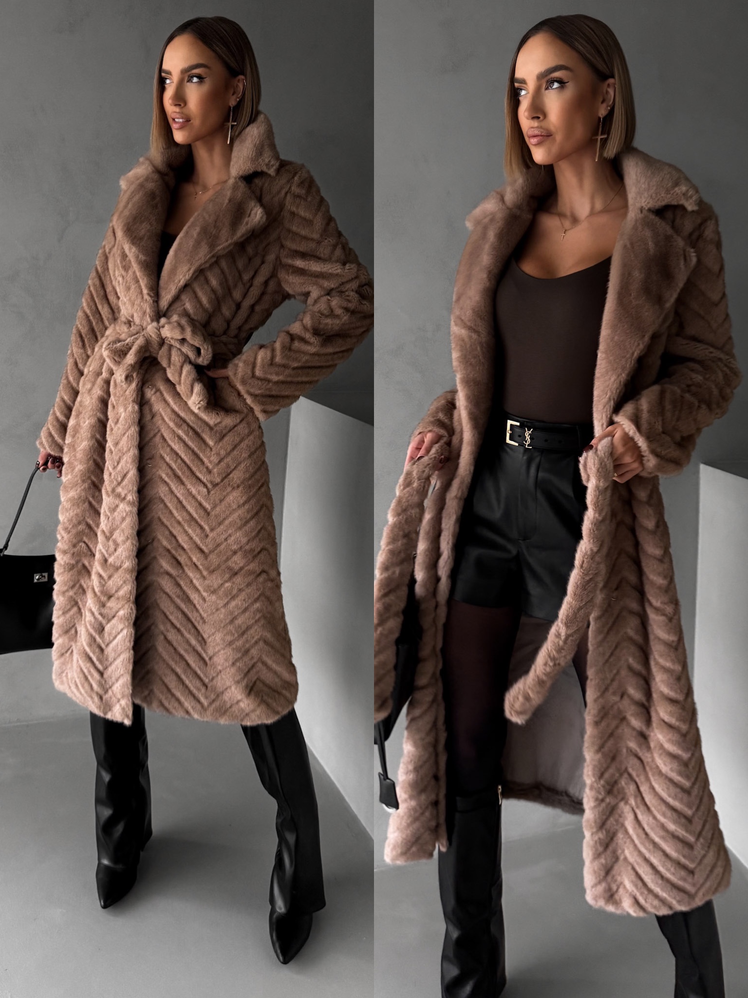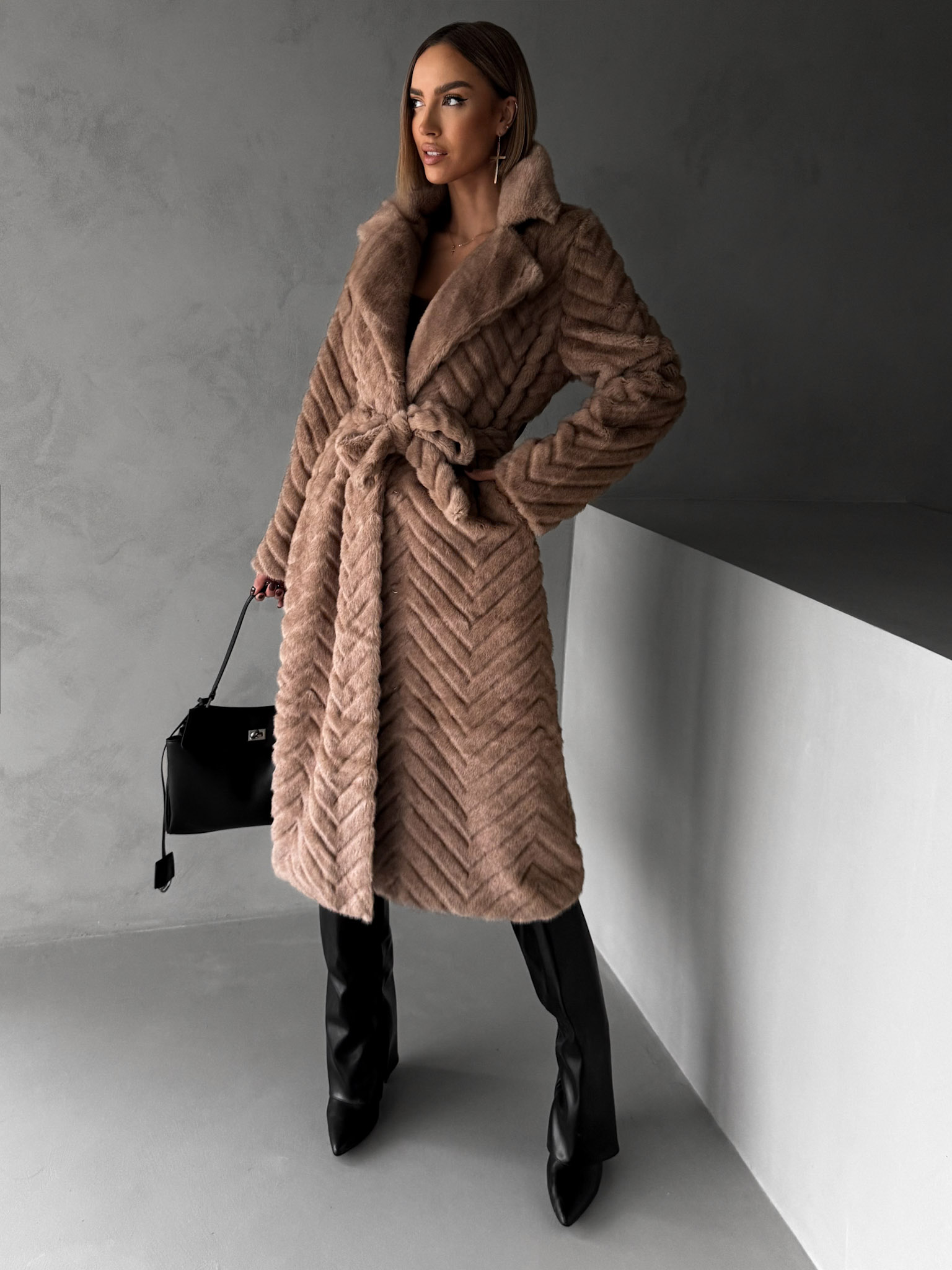 Tmavě hnědý plyšový kožešinový kabát TALAPATO Velikost: S/M