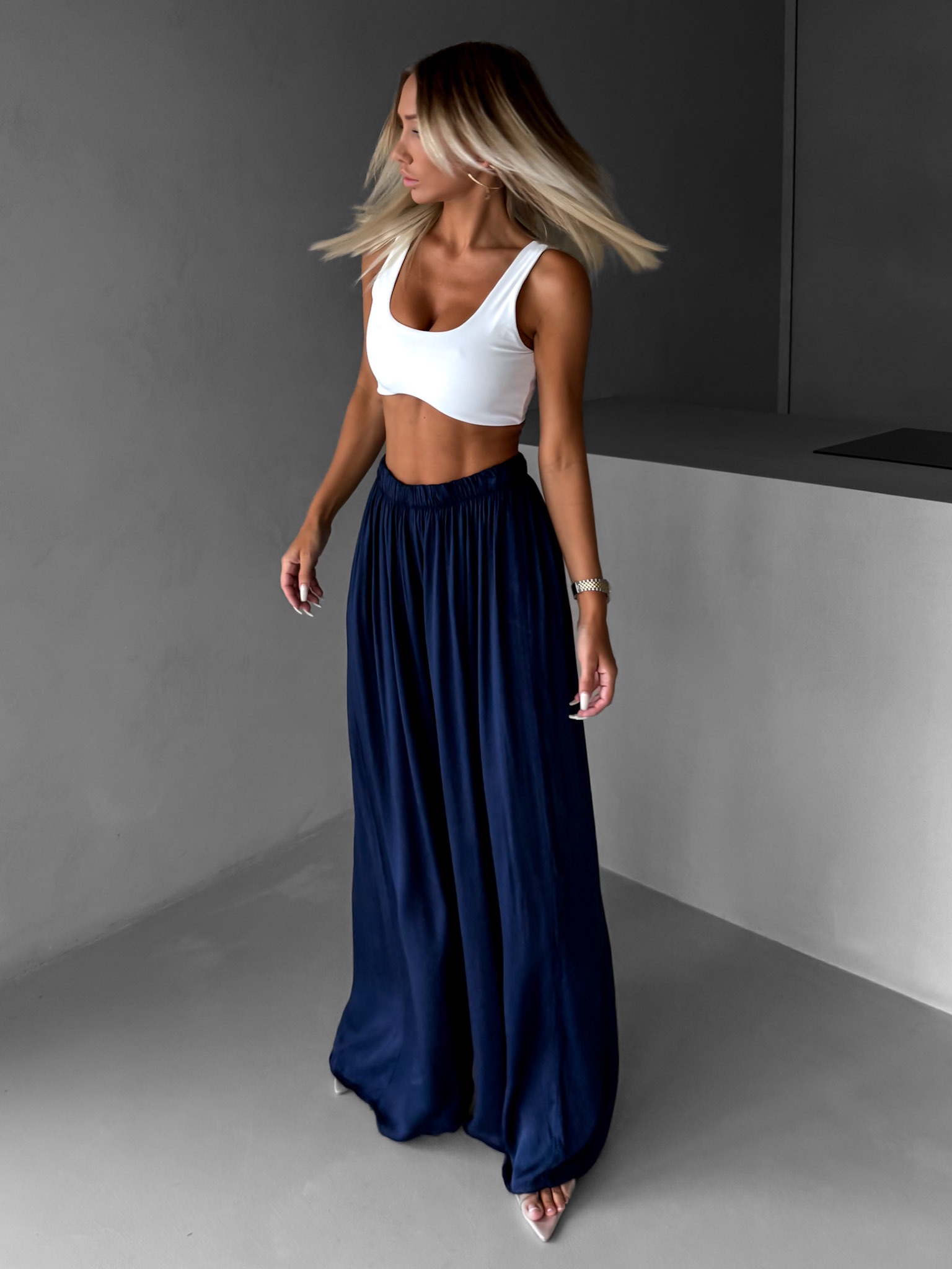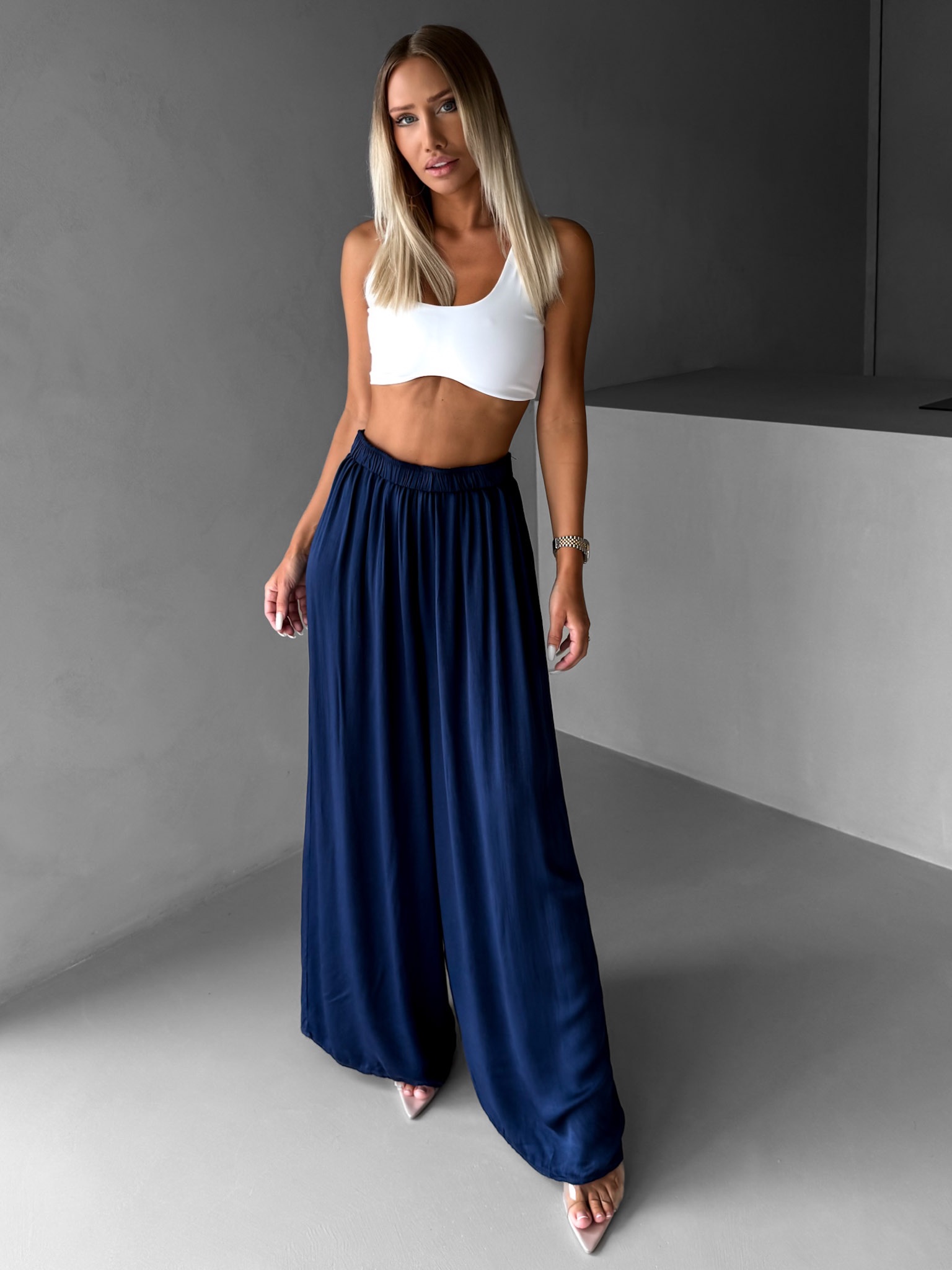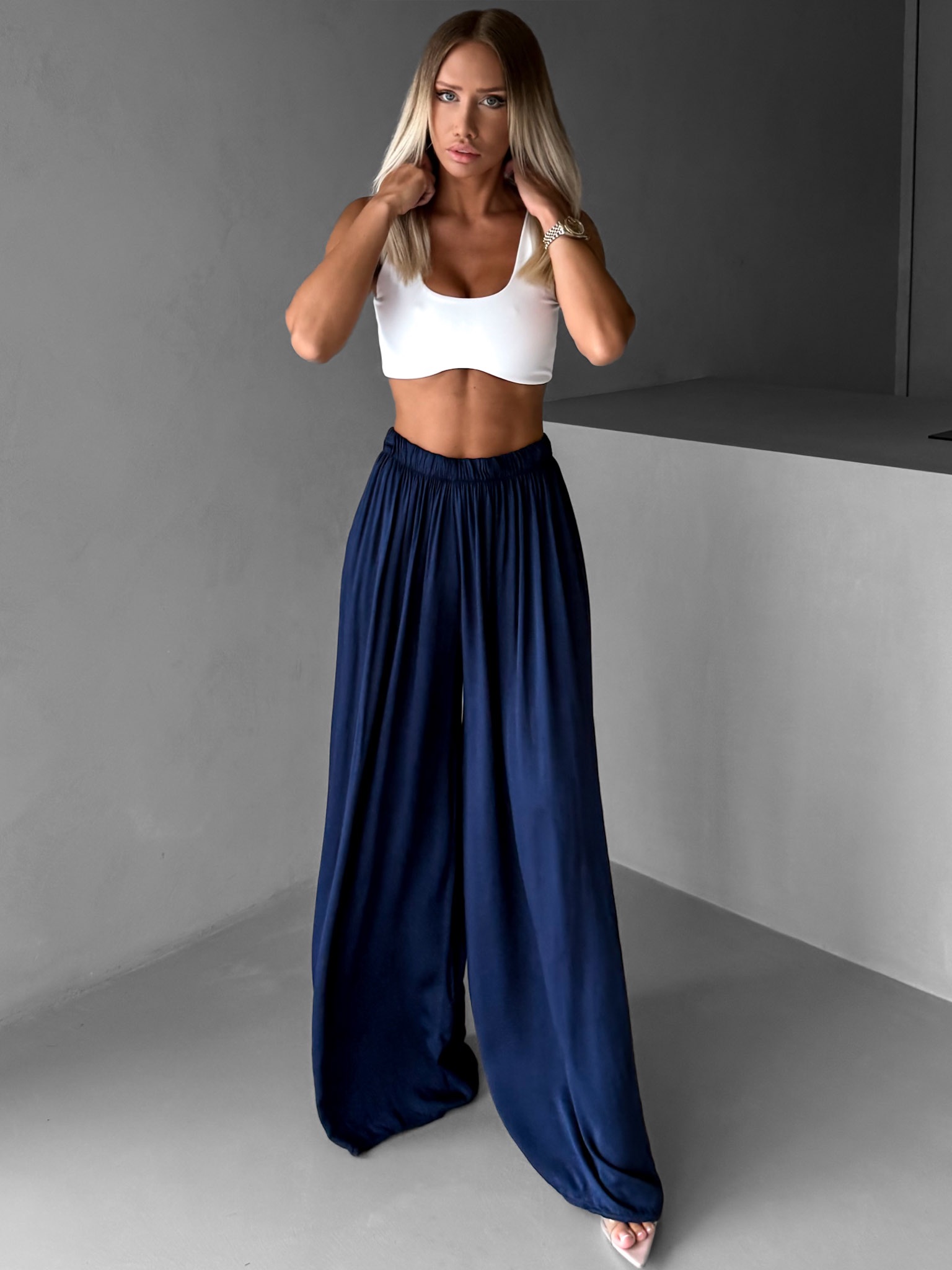 Tmavě modré široké volné dlouhé kalhoty OLVIRA Velikost: Standardní délka