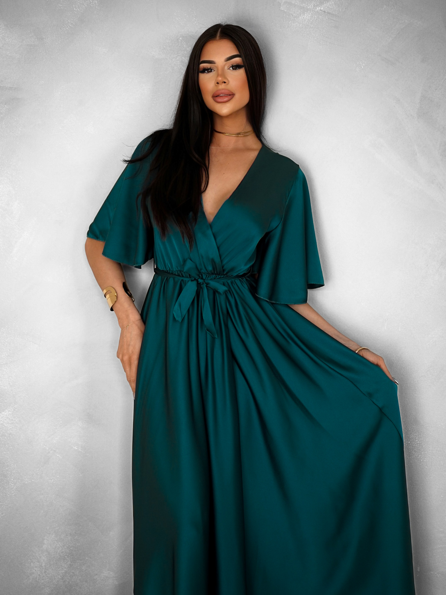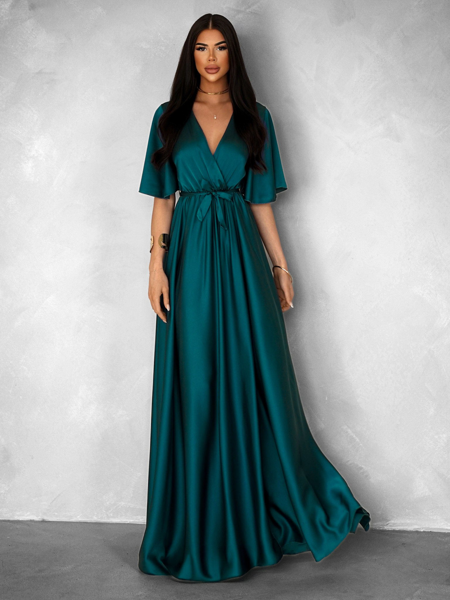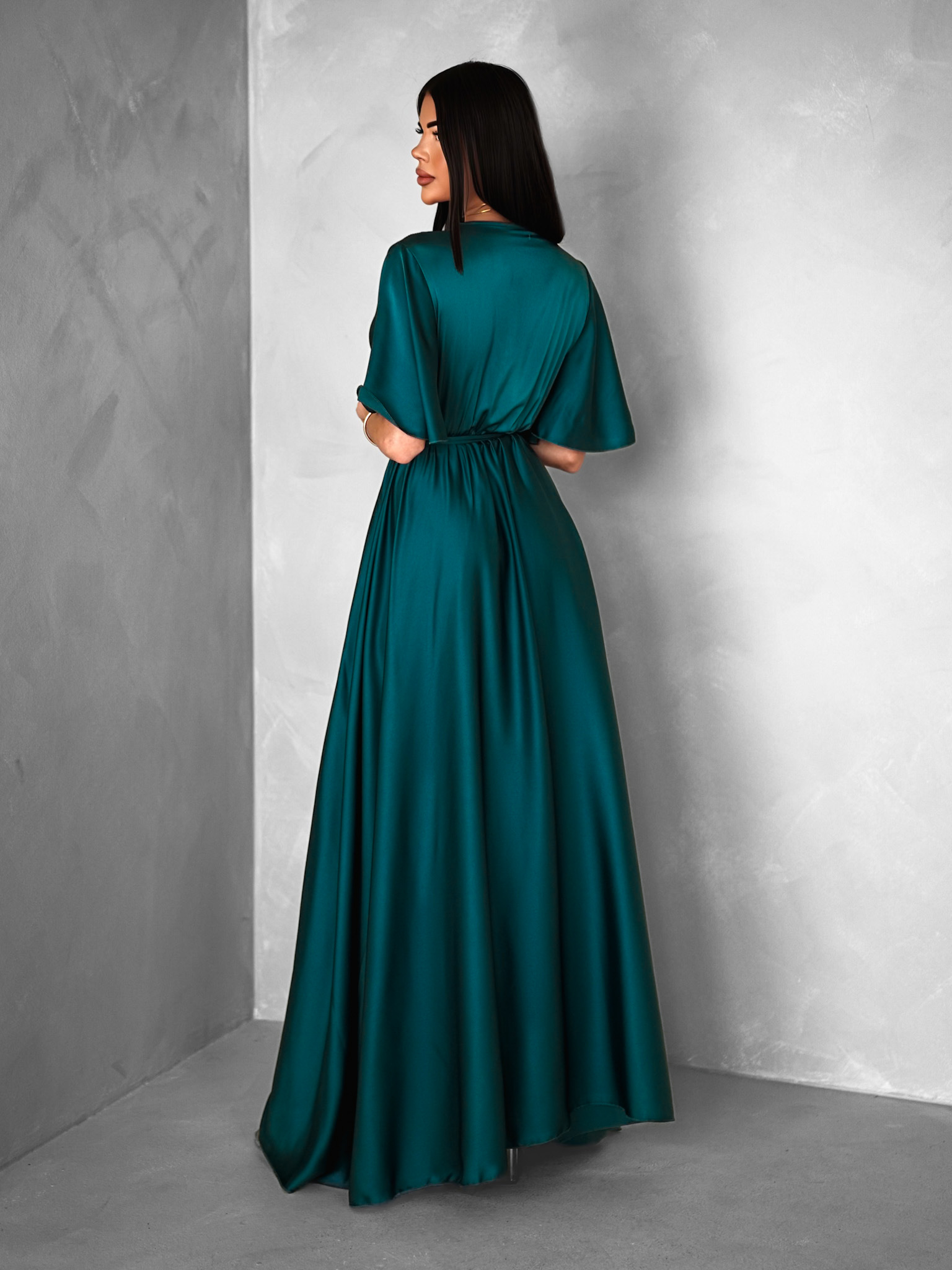 Tmavě petrolejové dlouhé saténové šaty GO HOME s krátkým rukávem Velikost: ONESIZE