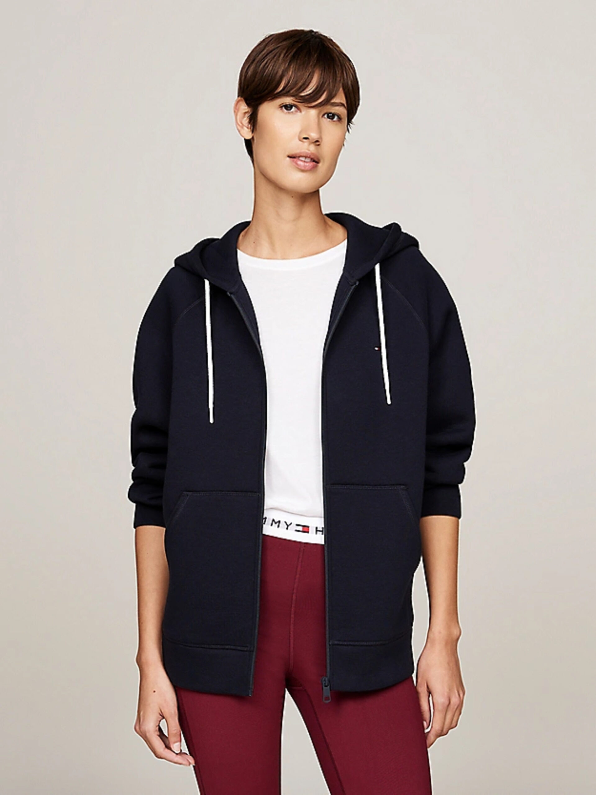 Dámská tmavě modrá mikina na zip od Tommy Hilfiger.Mikina má stahovací šňůrka u krku s kapucí.Materiál:79% bavlna21% polyesterStřih:relaxed fit