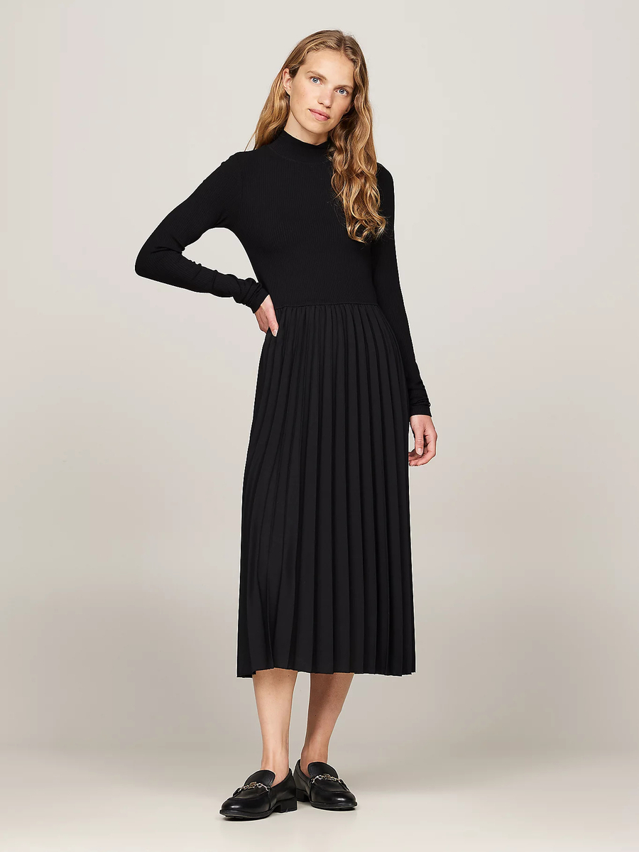 dámské černé šaty s plisovanou sukní od Tommy Hilfiger.Materiál:vrchní část 95% viskóza5% elastansukně 100% polyesterStřih:Slim fit