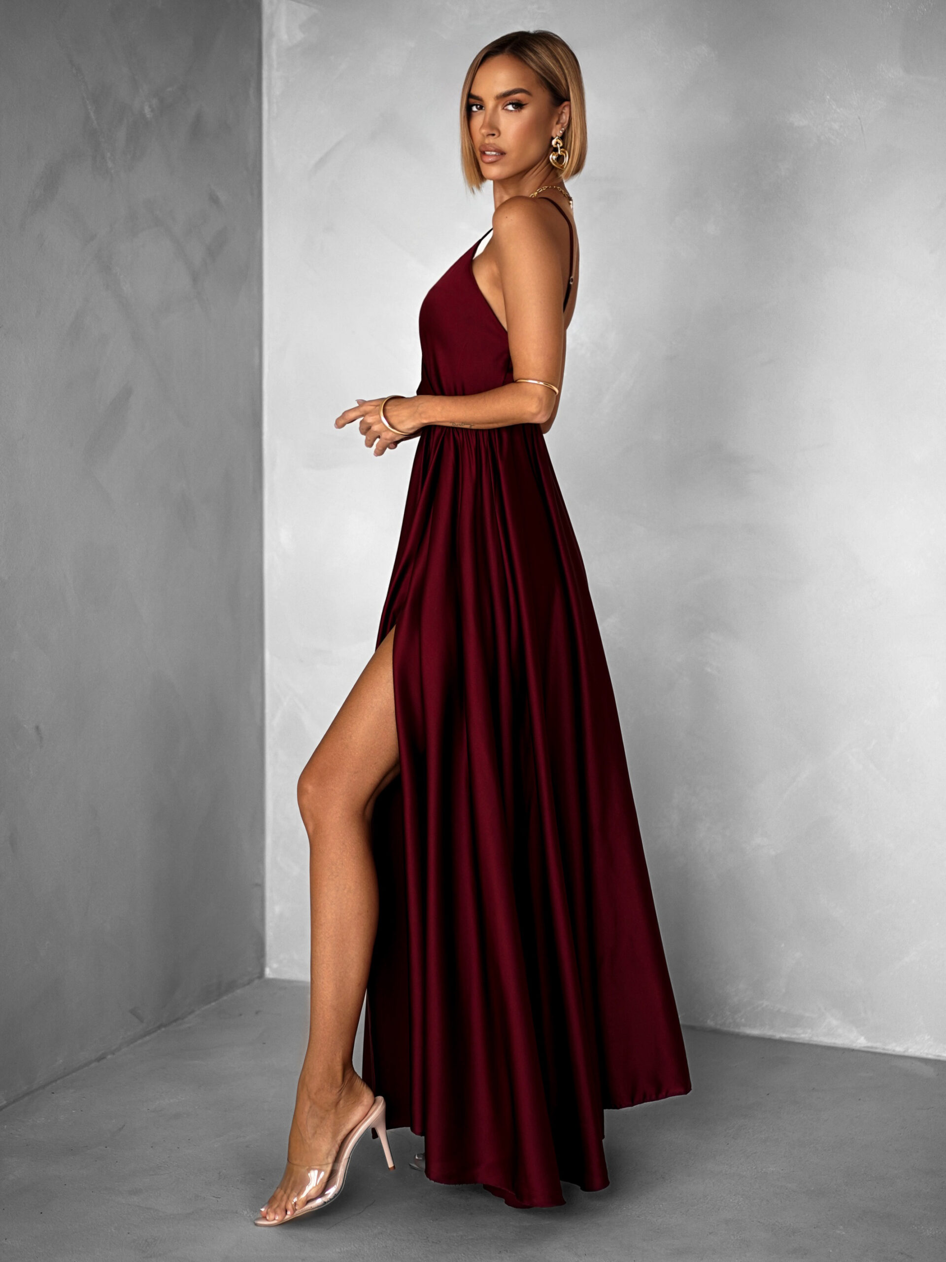 Vínové dlouhé saténové šaty PERFECTLY Velikost: ONESIZE