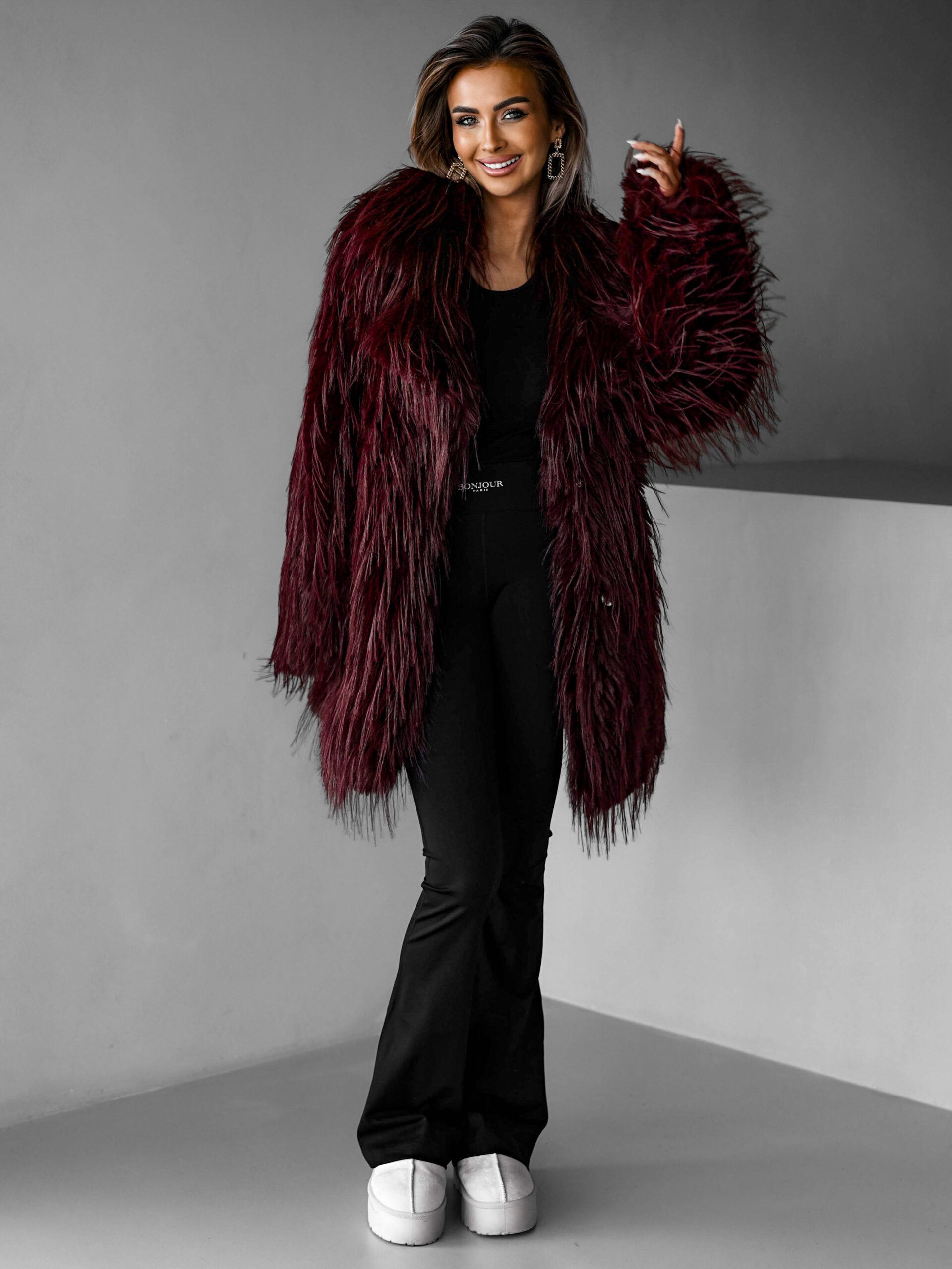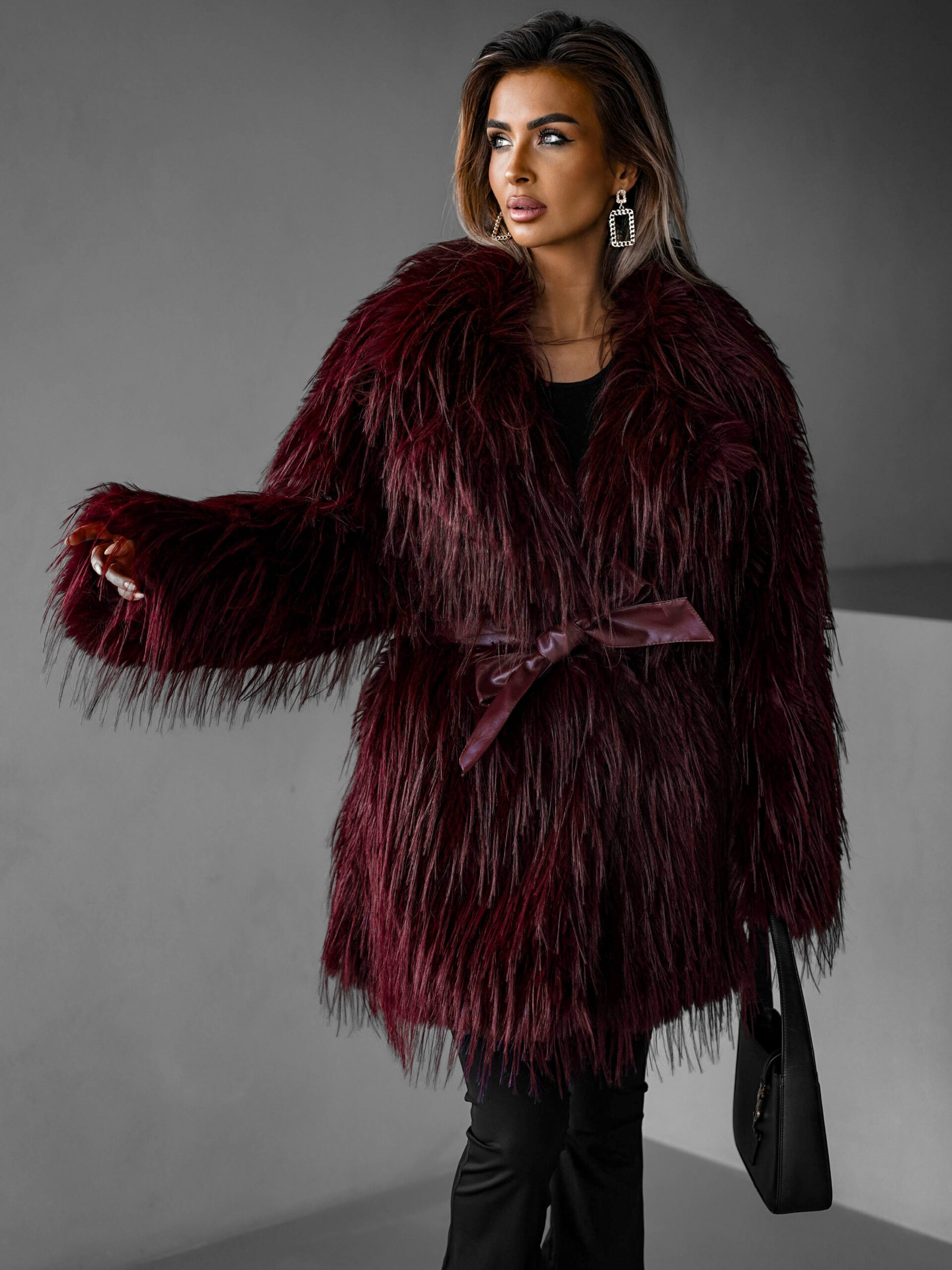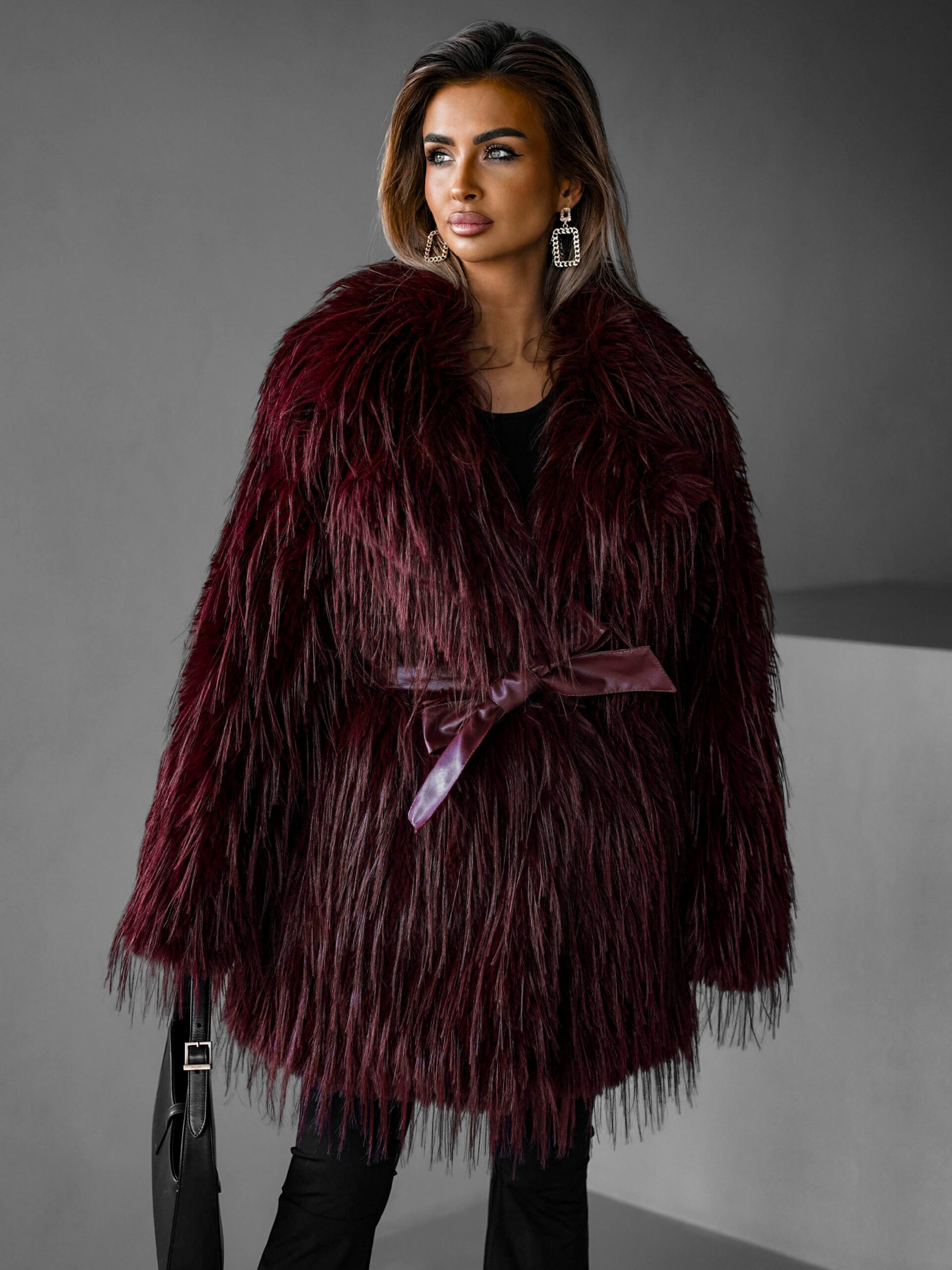 Vínový faux fur kožešinový kabát ALBERTO s páskem Velikost: M/L